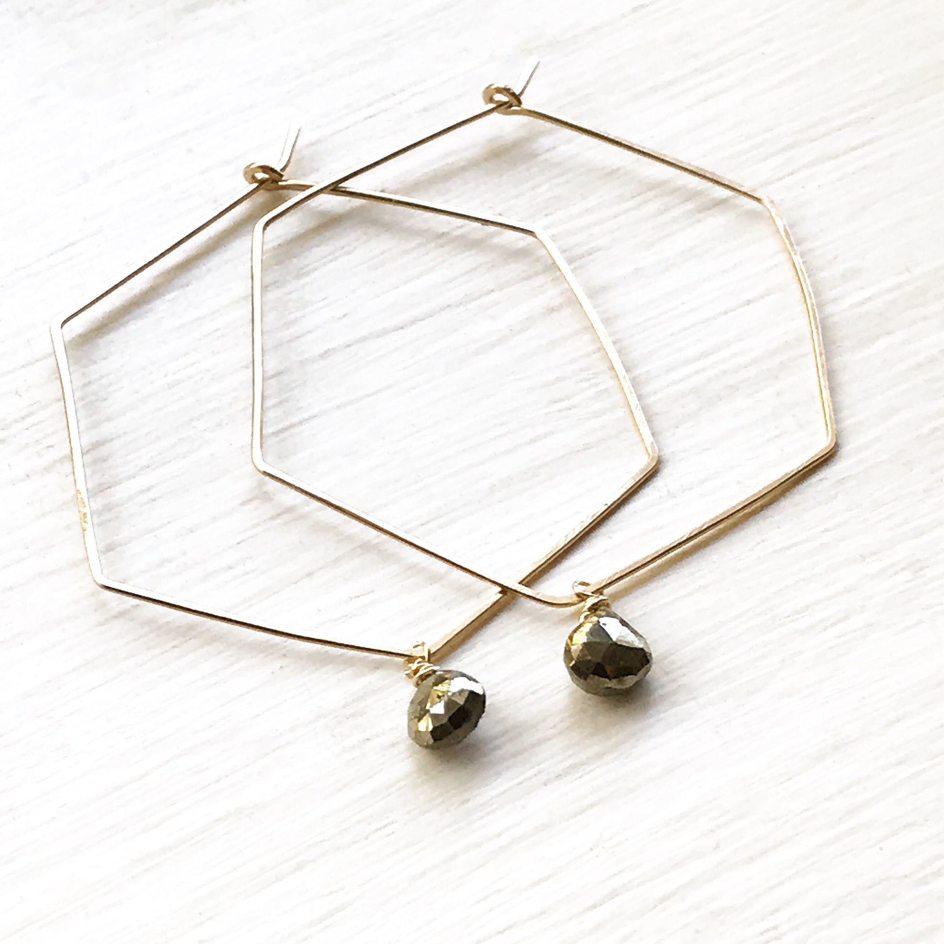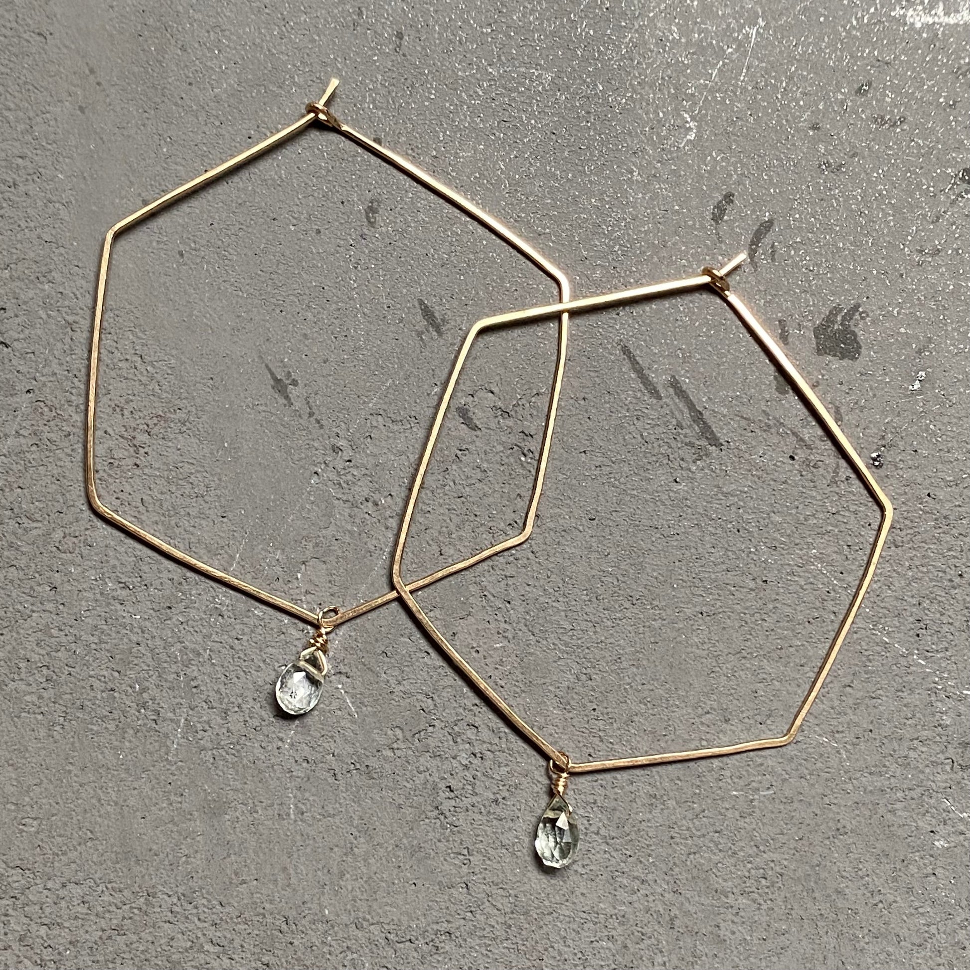 Hand-forged hexagon, hammered gold hoops + gorgeous teardrop briolettes! Add a brilliant touch to your wardrobe with these big sparklers!