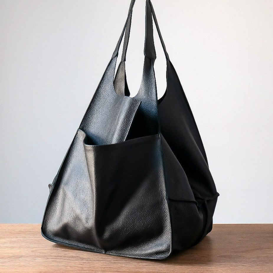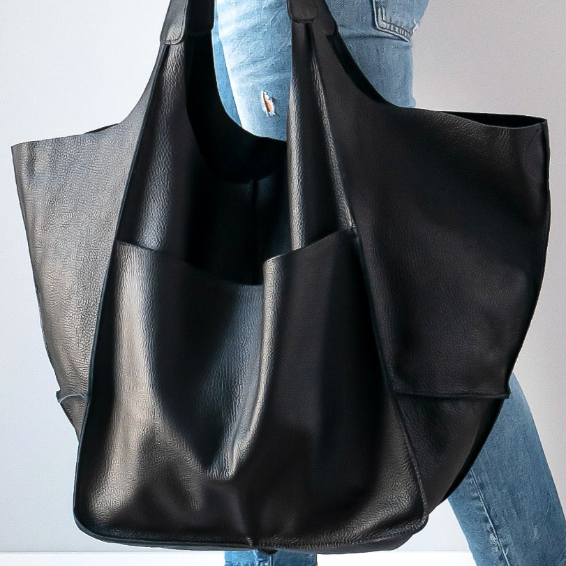 All jokes aside — she can carry 4 gallons of water, with even more piled on top. (We know because we had her do exactly that while prepping for a hurricane in Mexico!) Neither rain nor snow will harm the leather — heavy weight with a light sheen on the exterior, and super luxe suede interior. Drapes so beautifully, allowing you to only carry a few items if you prefer.