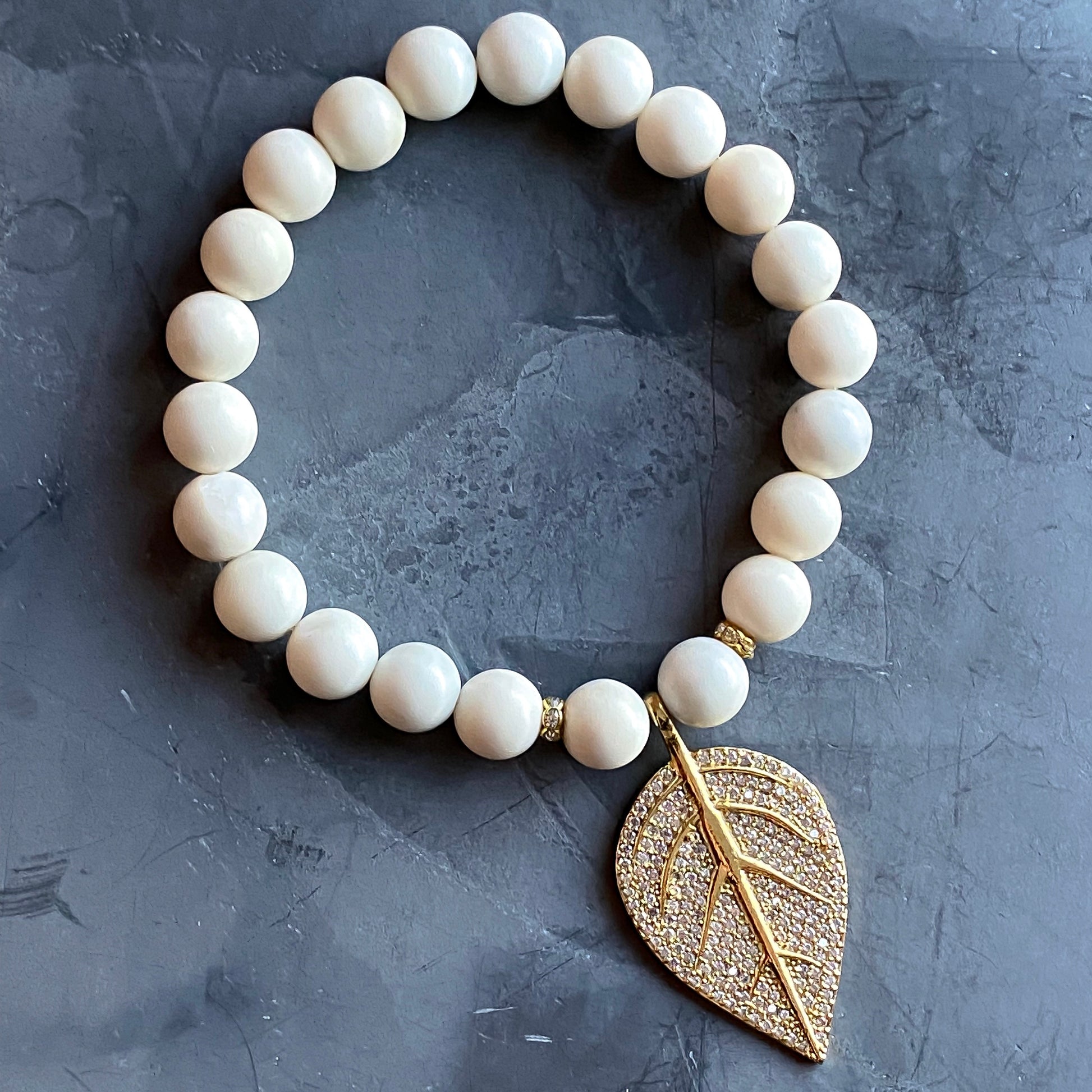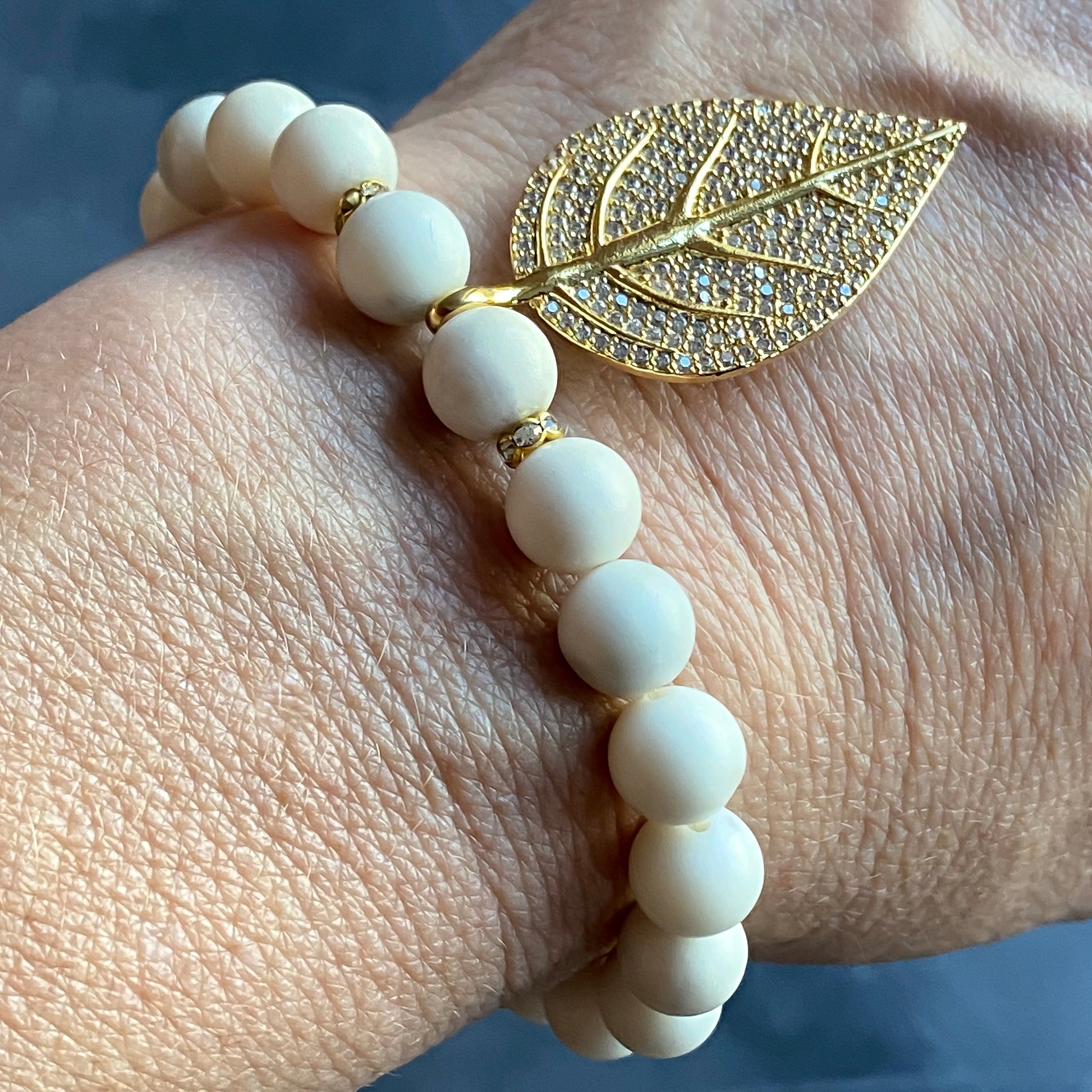 • Ivory Jasper: Promotes inner reflection, peace, and consistency. Adorned with a large 24k gold vermeil pavé diamondette leaf.