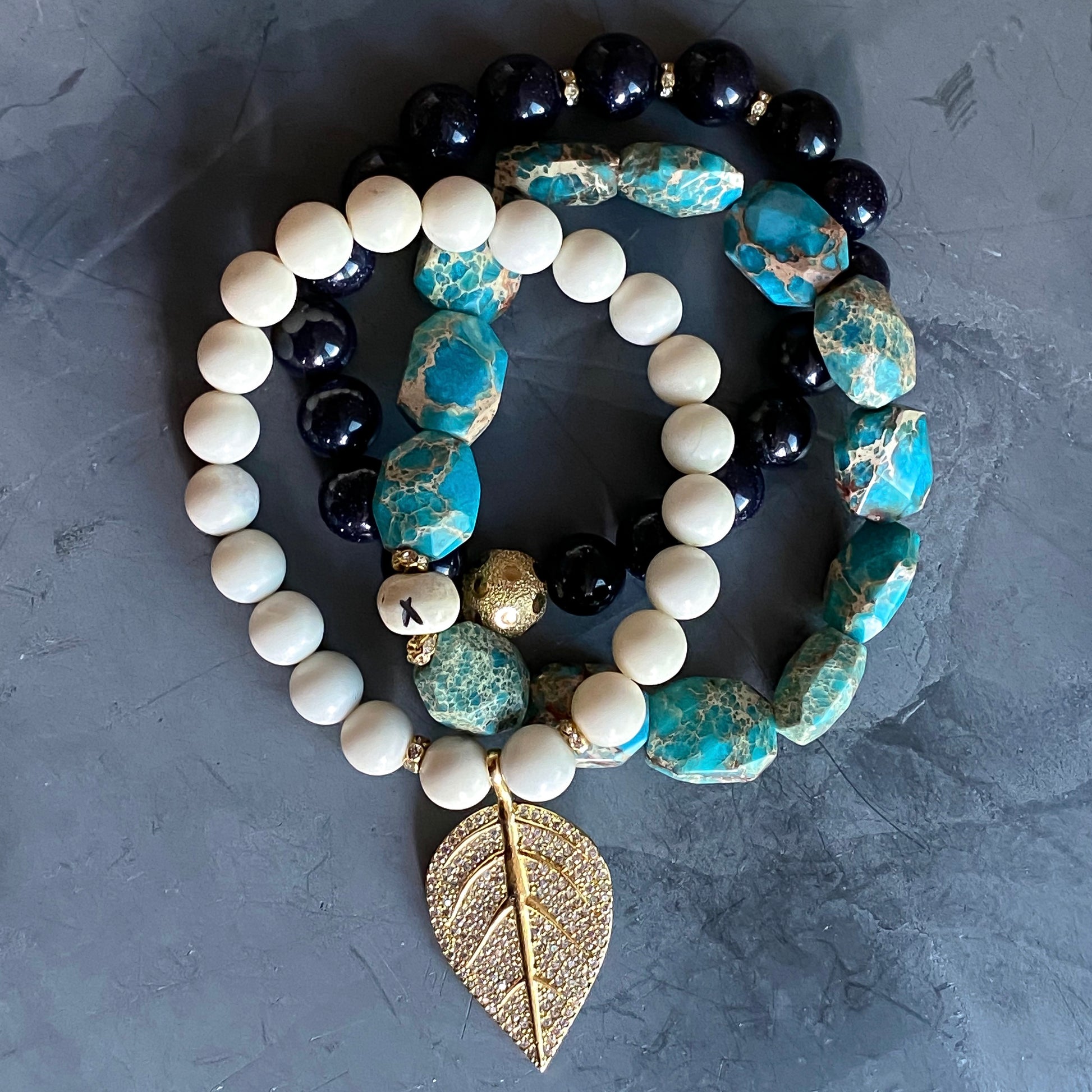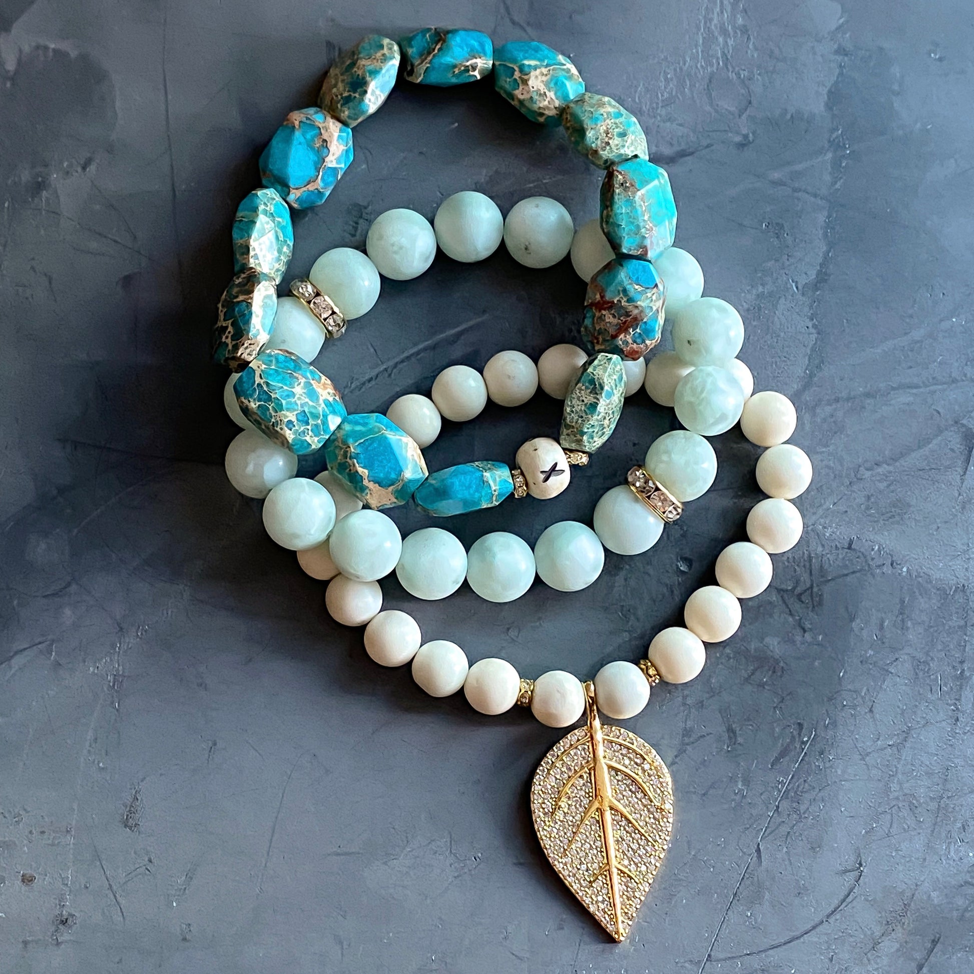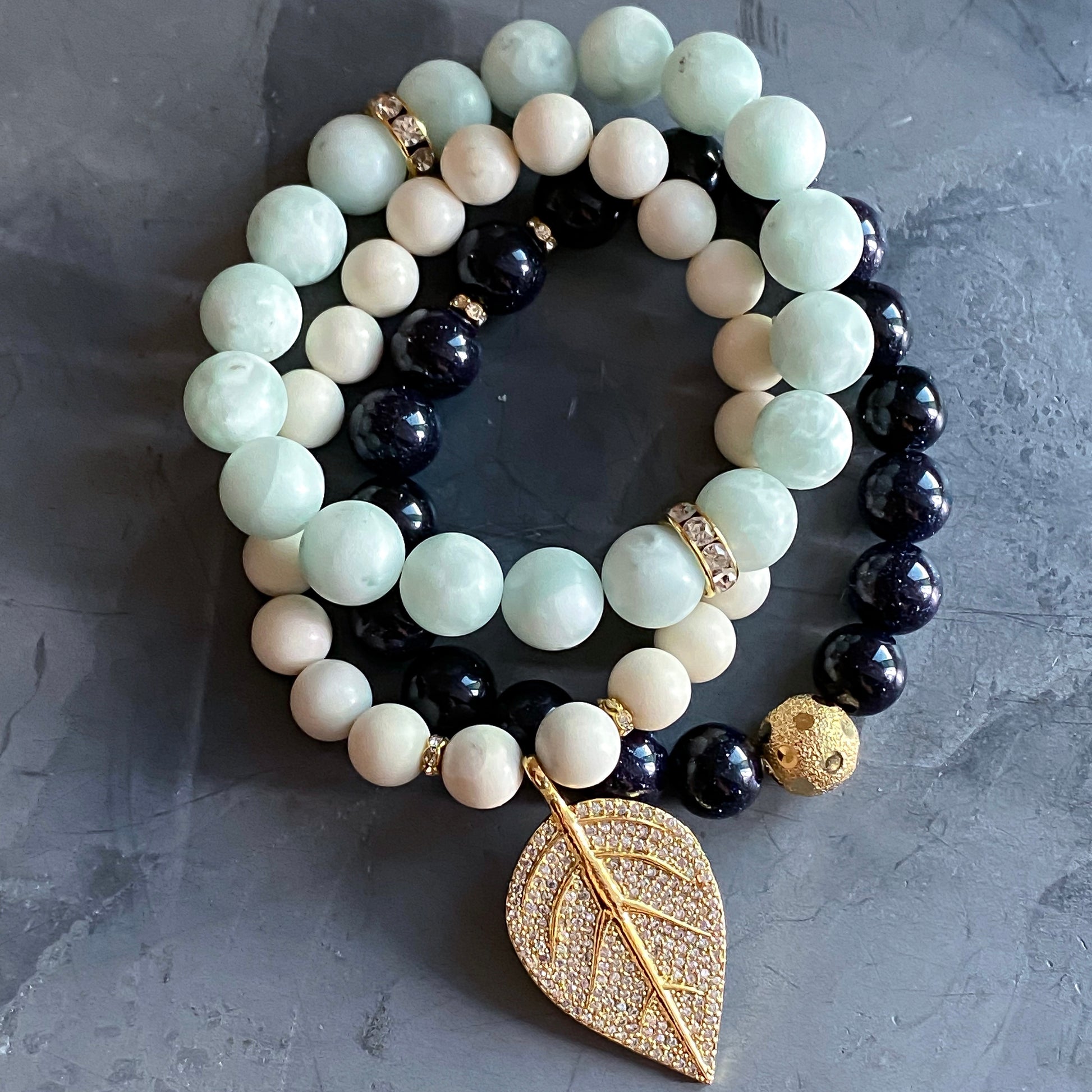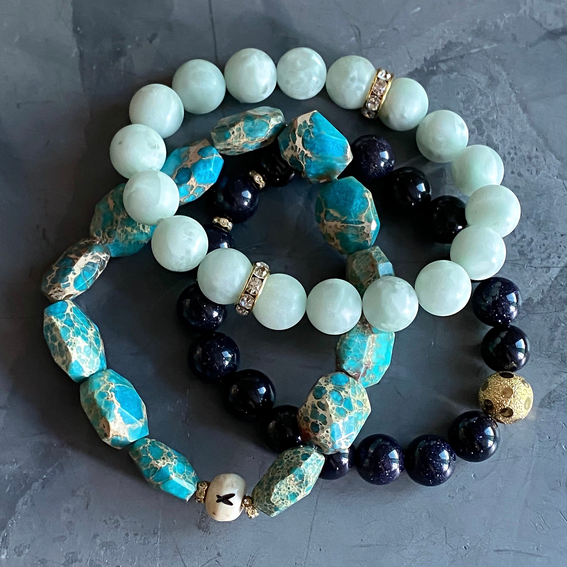 A Variety of Stunning Stones Inspired by the Sea. Choose a single bracelet, or create your own stunning stack of three. Each piece is crafted with care and designed to promote calmness, balance, and good fortune.