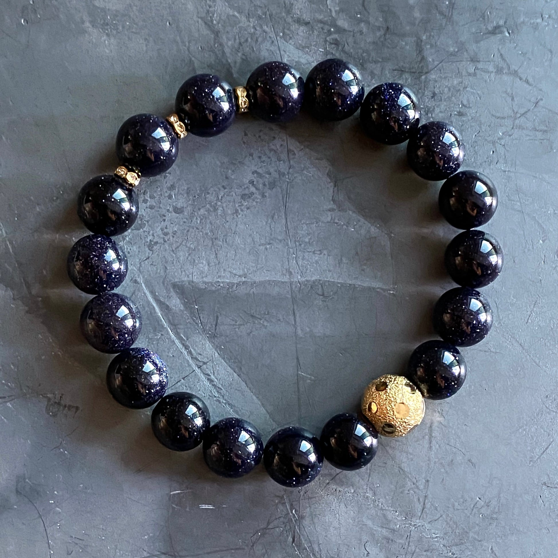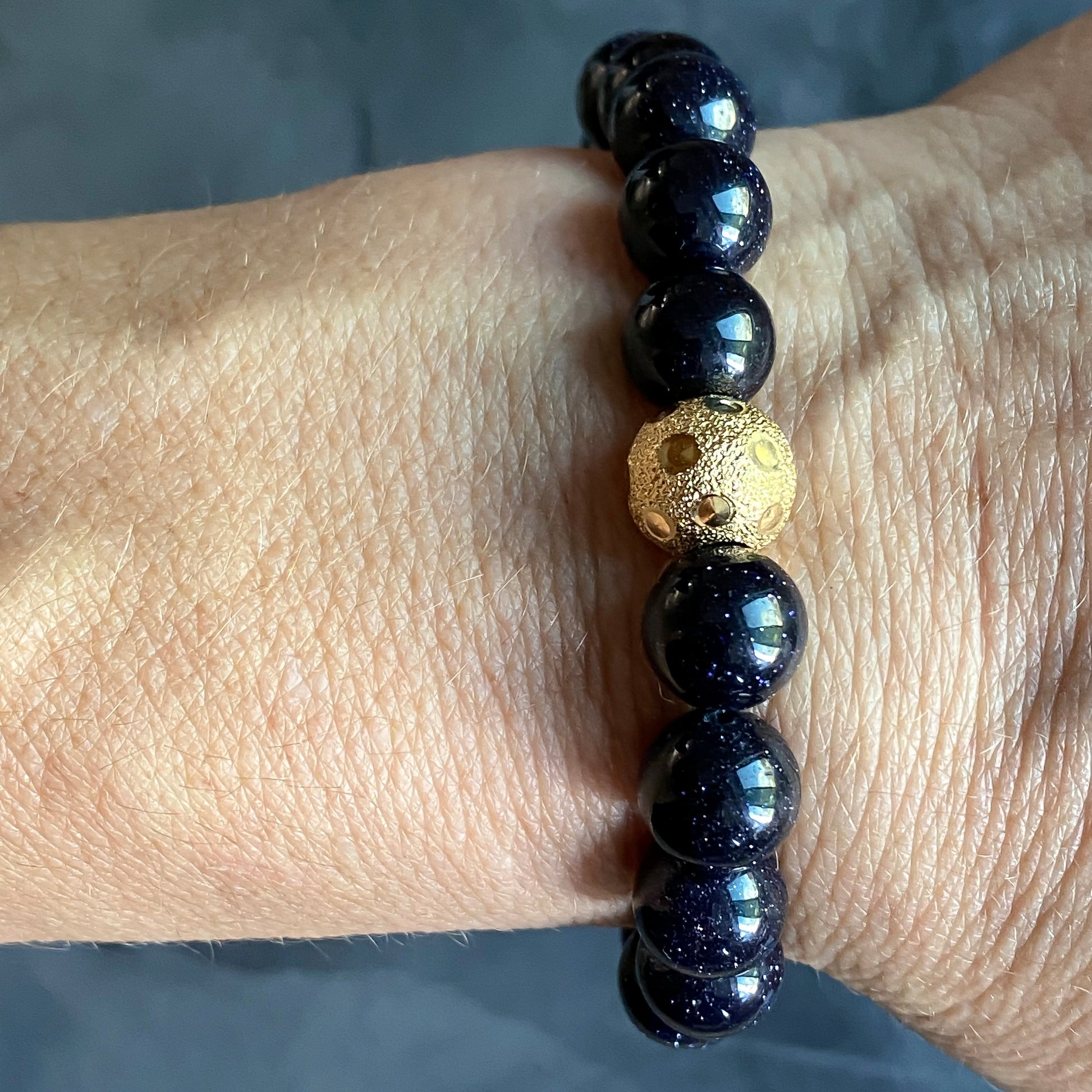 • Blue Goldstone: A protective stone that deflects negative energies and invites good luck. Accented with a 24k gold over sterling silver diamond-cut bead.