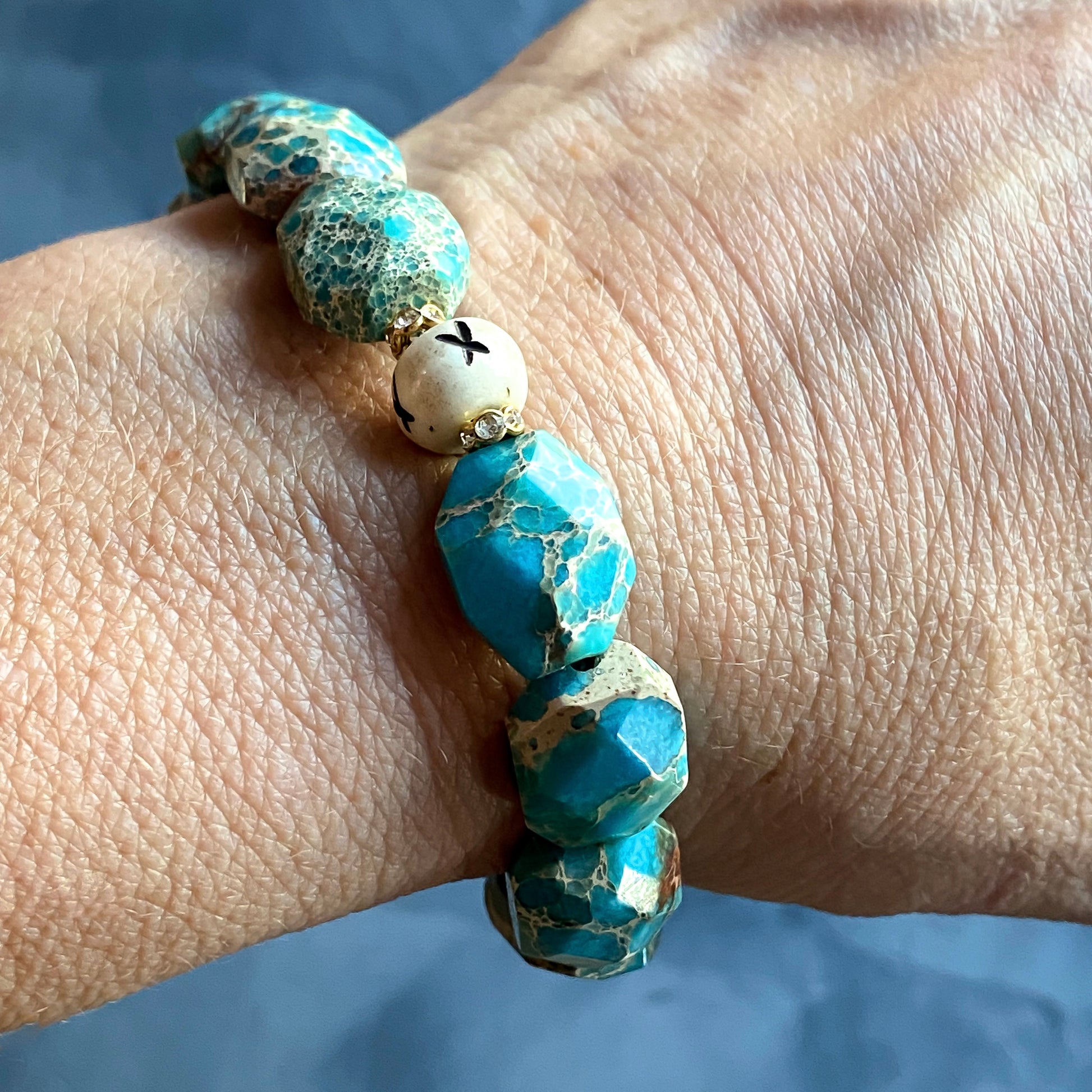 • Sea Sediment Jasper: Brings tranquility, balance, emotional healing, and soothes the mind. Features carved bone and diamondette spacer beads.
