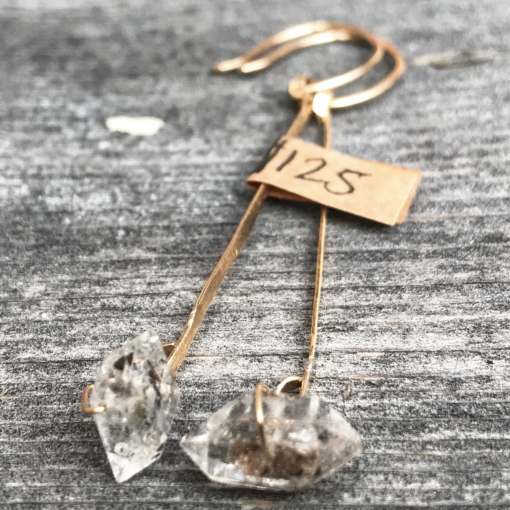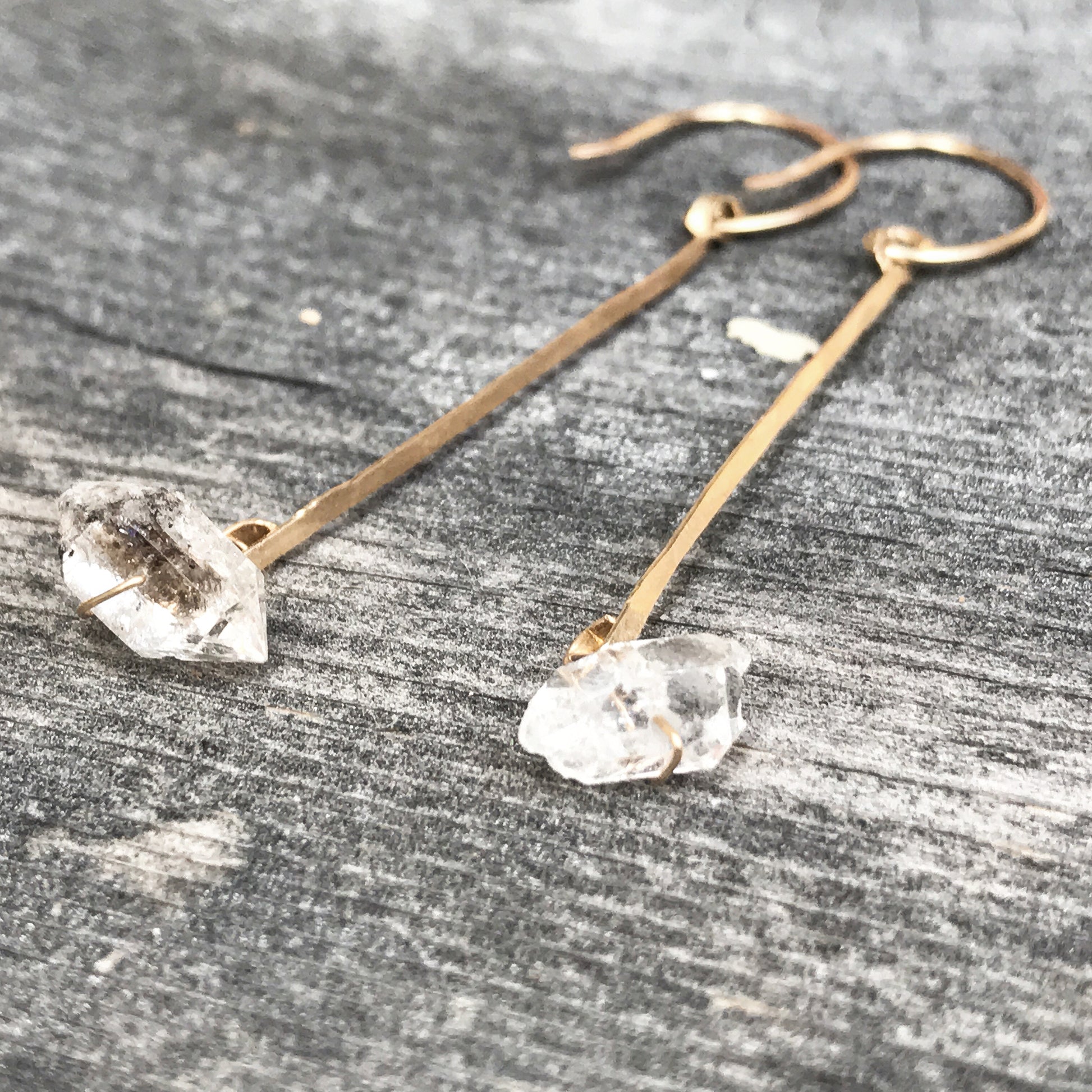 Hand-forged, super skinny hammered 14 karat gf earrings, featuring gorgeous Herkimer Diamonds. The golden sticks dance with your movement, and the gems reflect so much light!