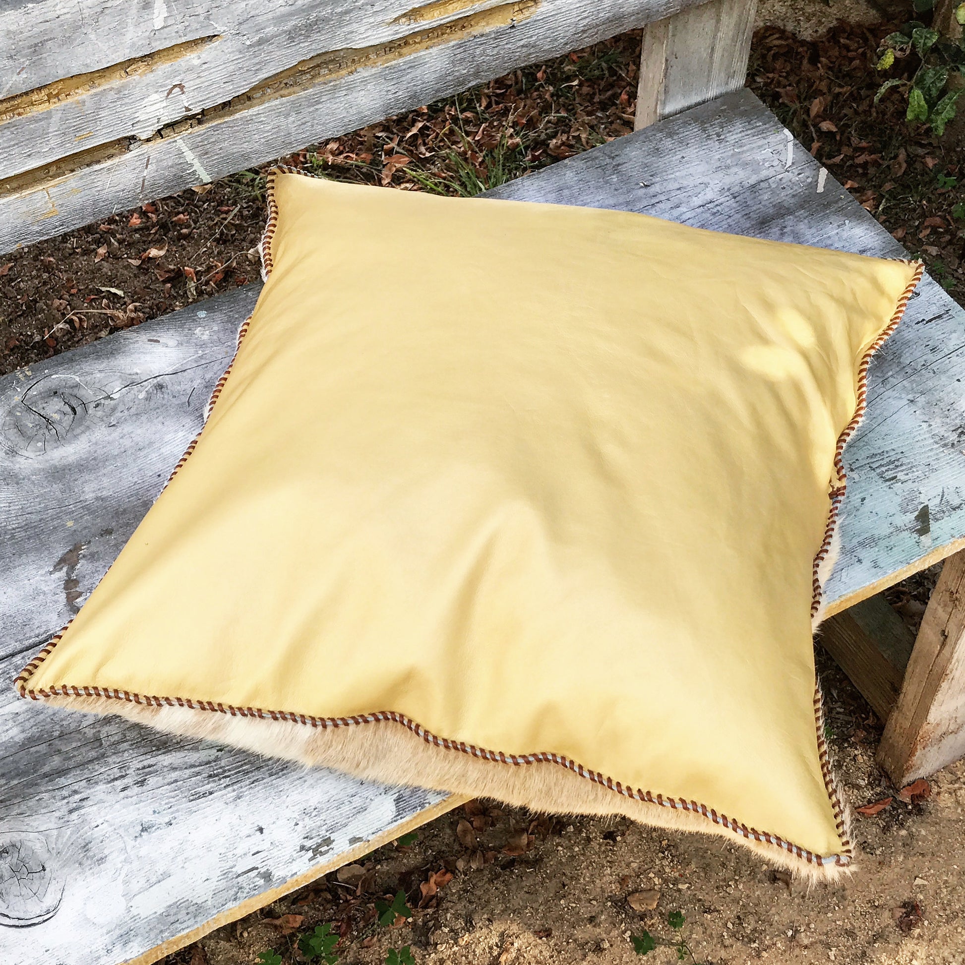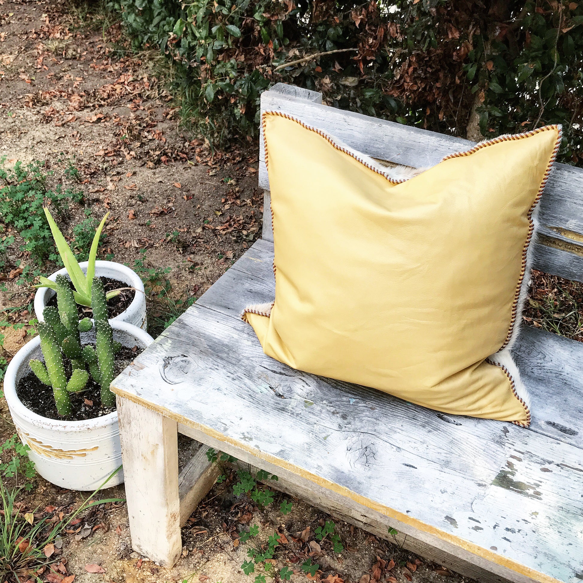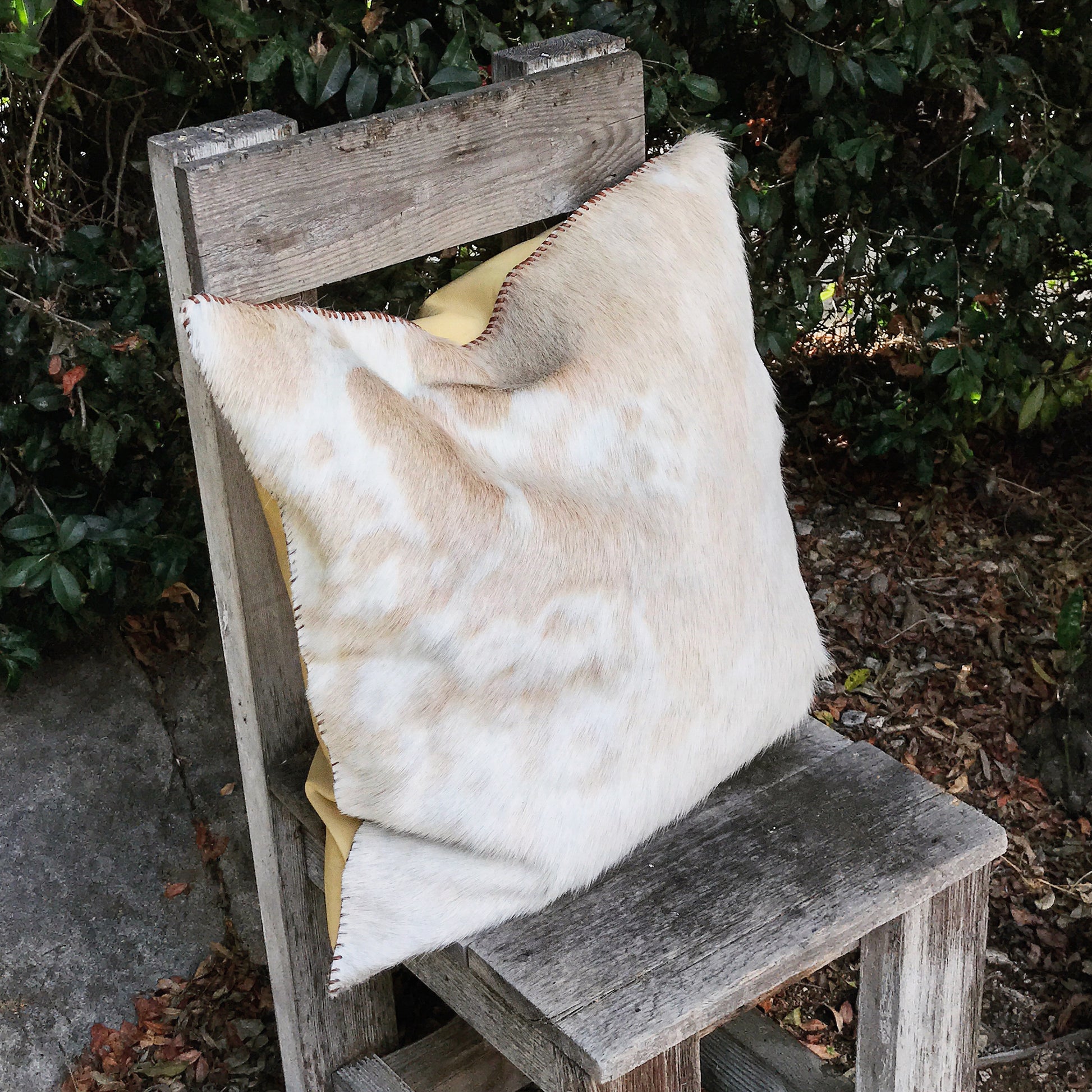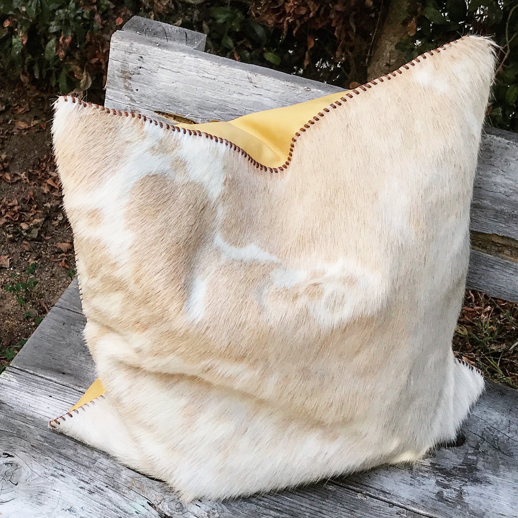 These incredibly comfy lambskin + long hair on hide pillows are hand-stitched with calf lacing, and stuffed with down feathers. One side is silky straw yellow lambskin, and the other is super soft hair on hide.