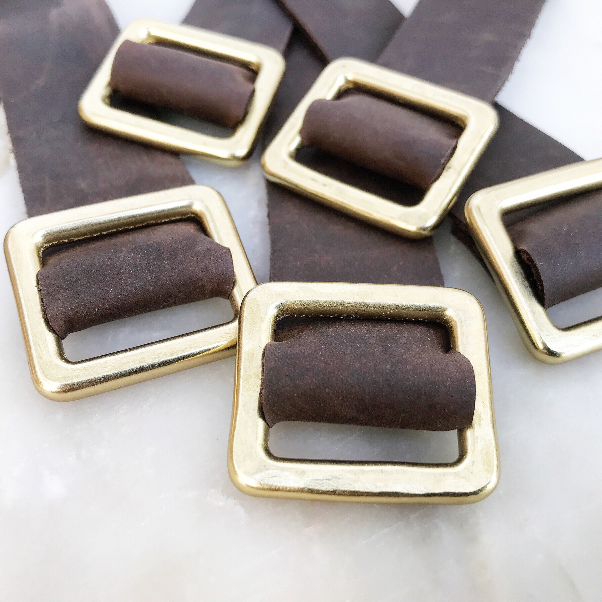 Gorgeous top-grain distressed leather is beautifully tanned with oil + wax. Gets lighter when stretched, and darker when touched. Wraps around your wrist, and is secured with a hammered solid brass buckle.
