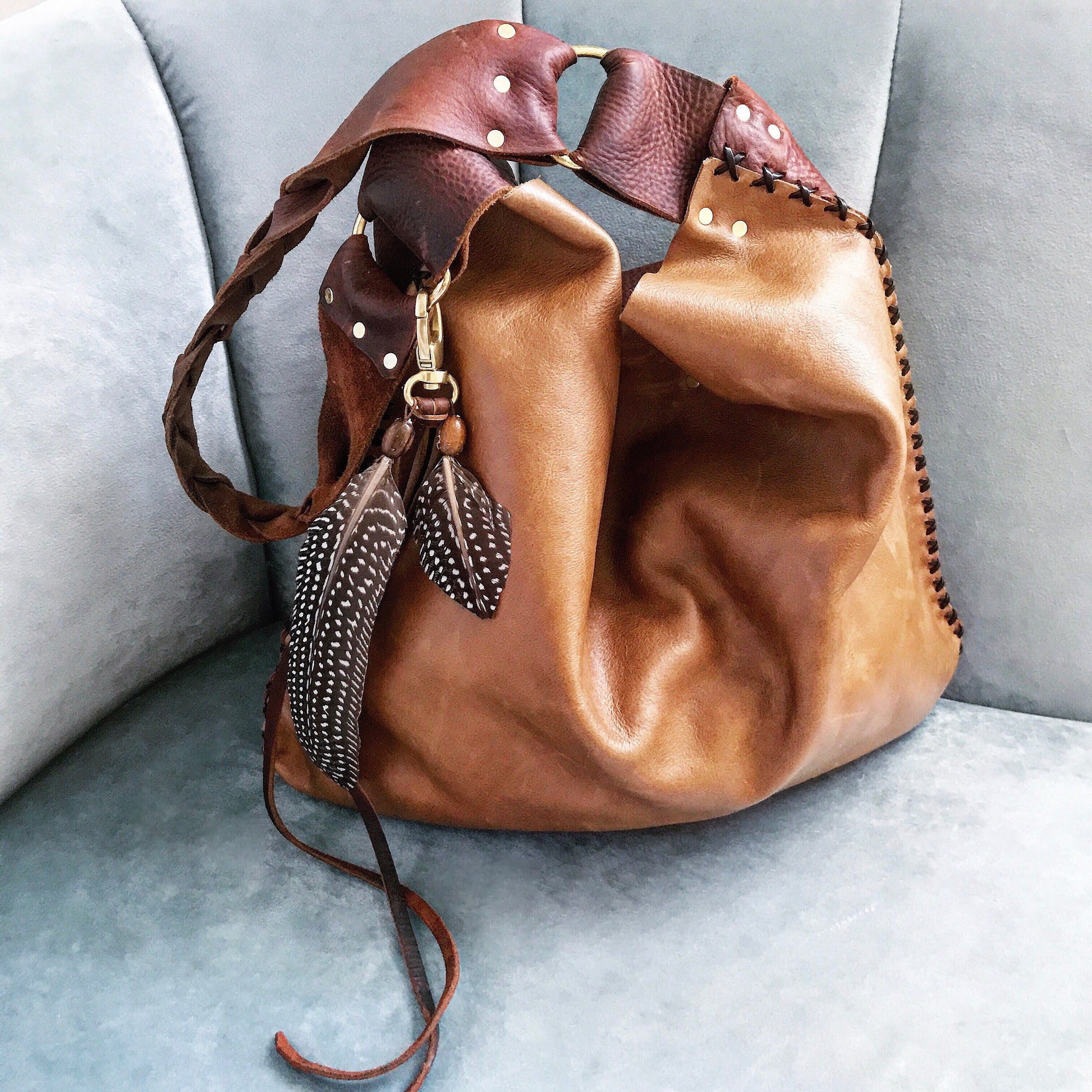 Top grain luxuriously soft leather with a beautiful sheen, criss-cross stitching, and brass hardware. Large interior pocket + exterior pocket on the back. Removable solid brass feather tassel.
