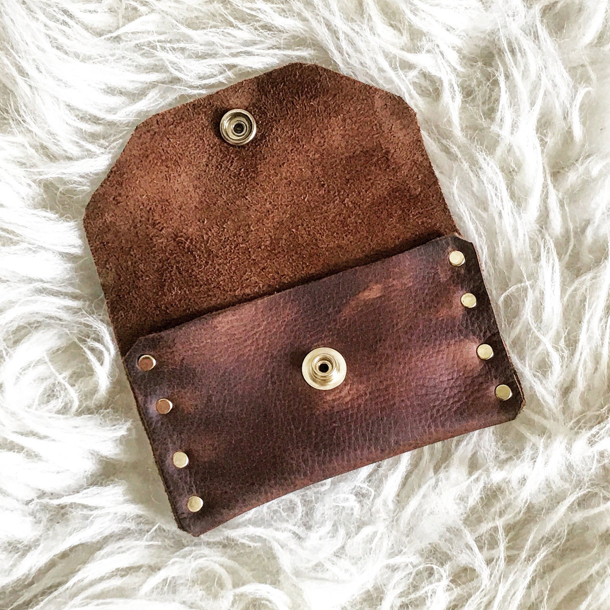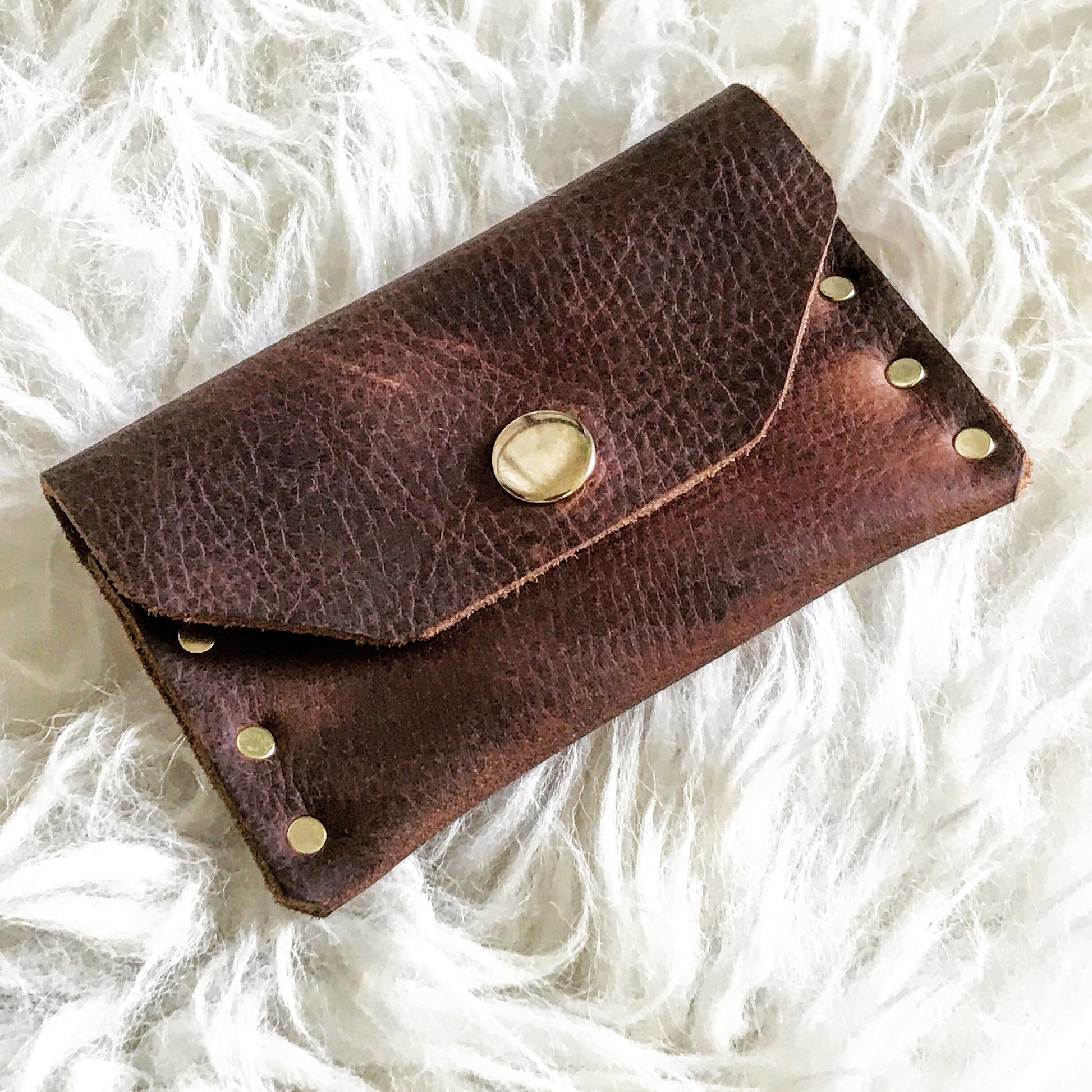 Solid brass rivets add a touch of style to this simple card + cash holder. Holds a few credit cards and small cash. Slips into your pocket or purse.