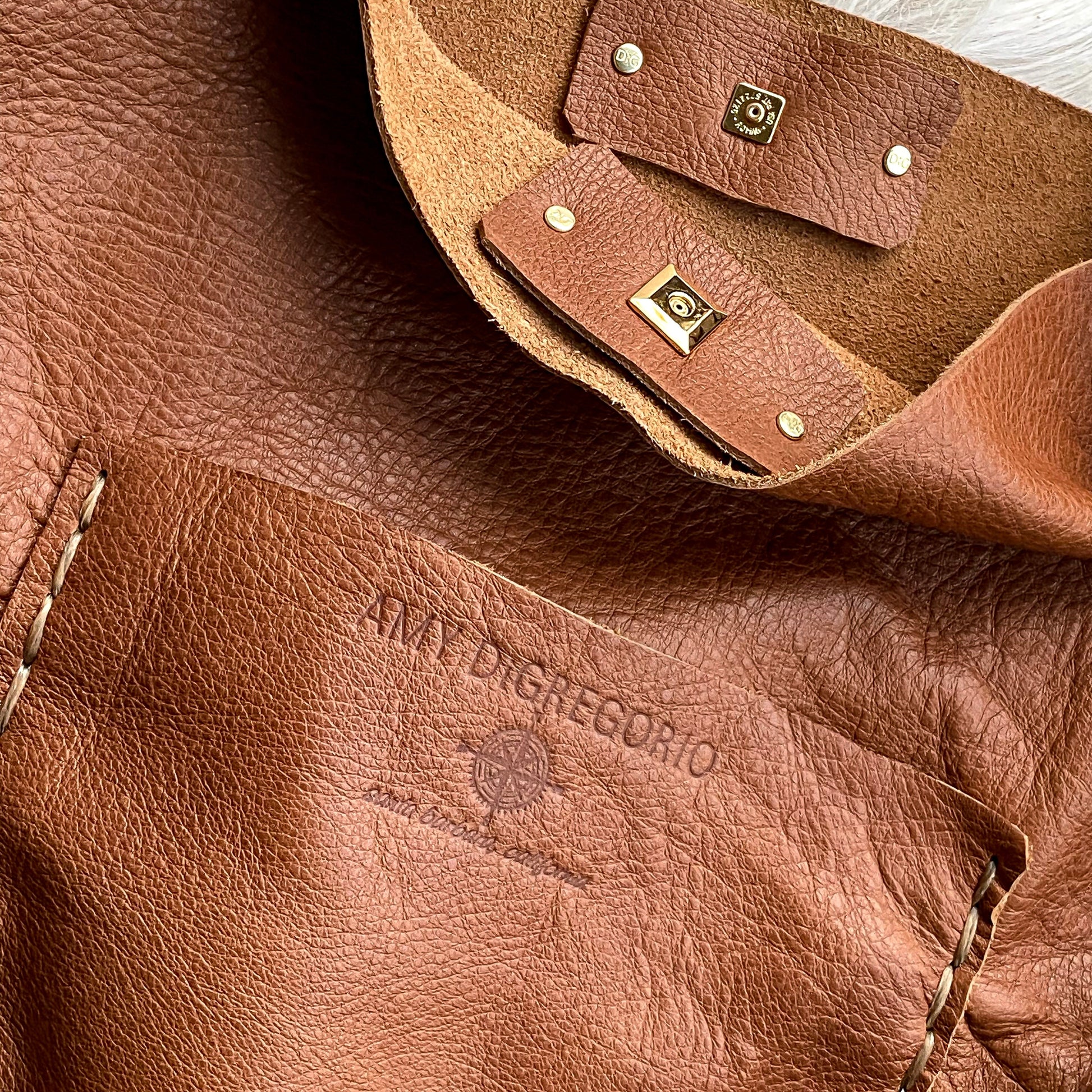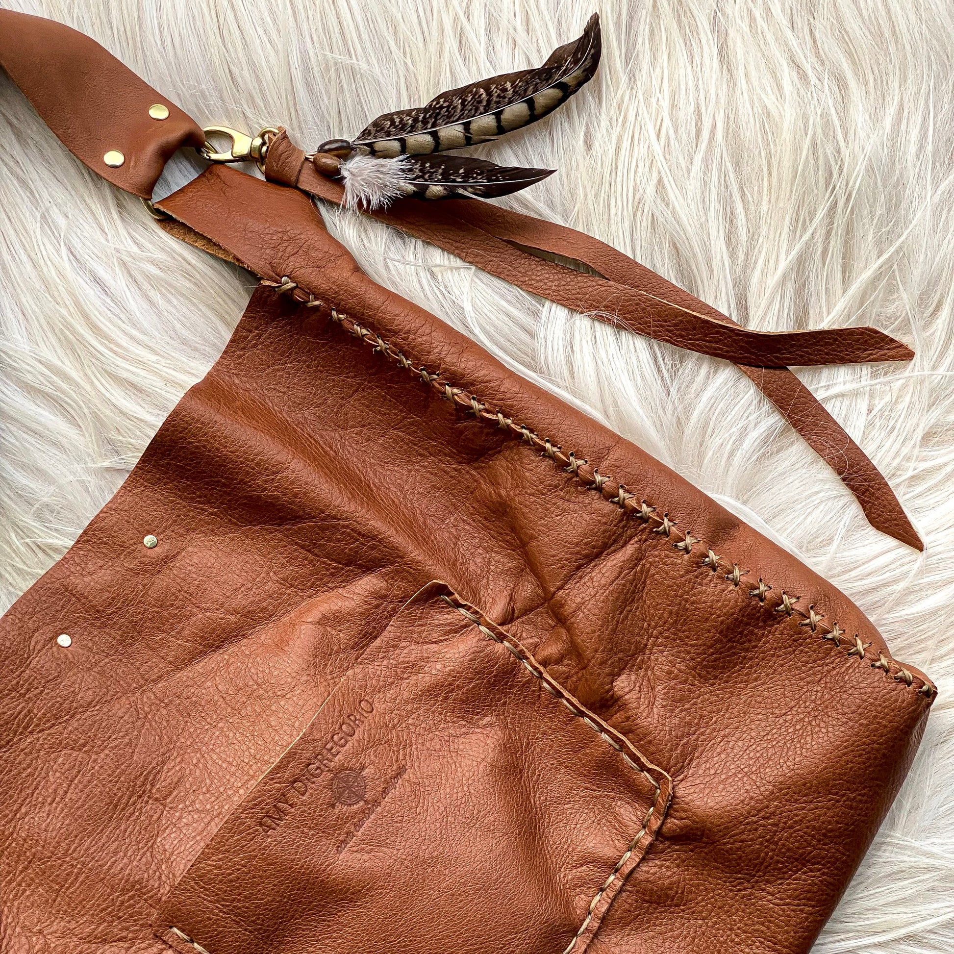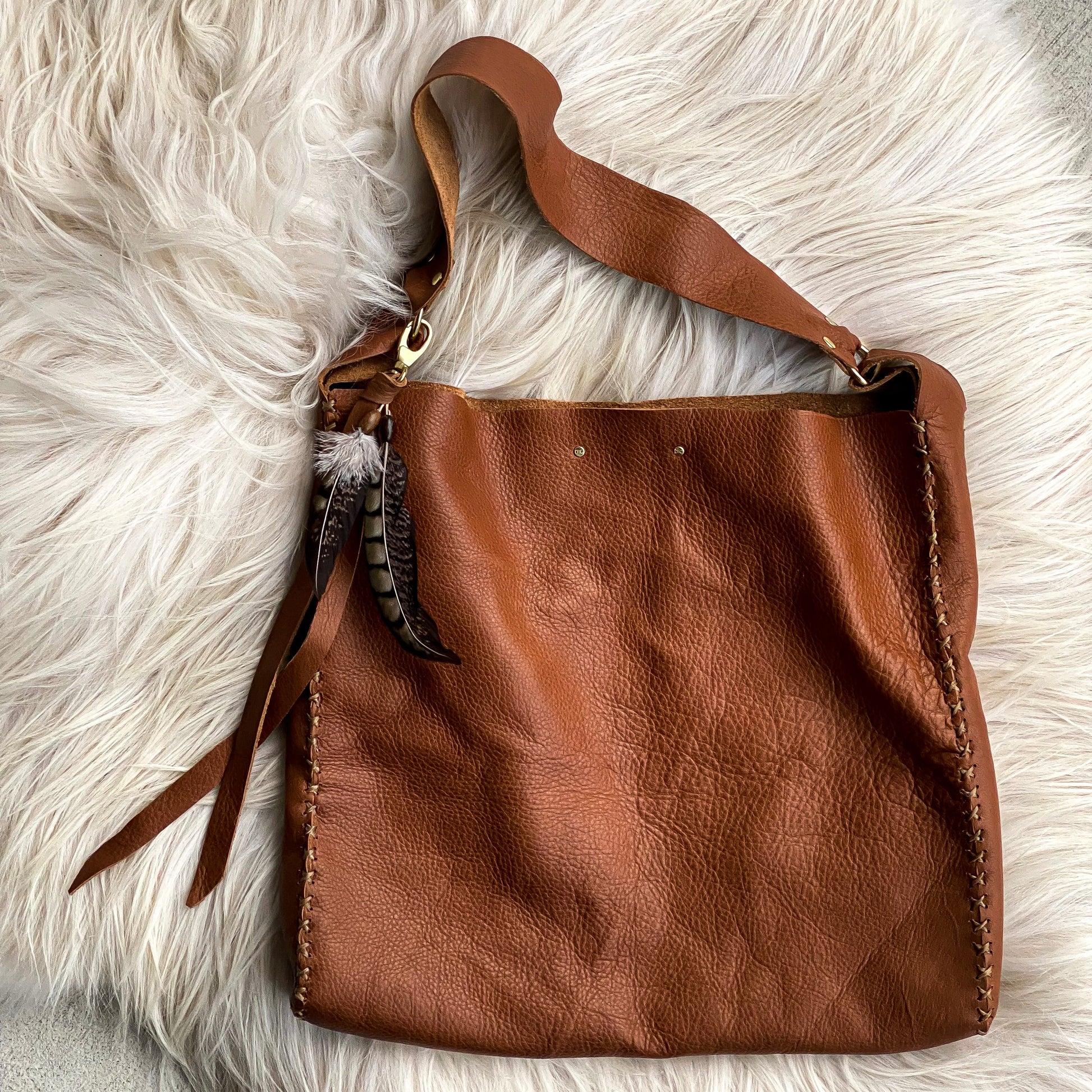 Iron-branded + designed entirely by hand with the highest quality + softest leather on the market. Gorgeous pronounced grain, brass hardware, roomy interior with large pocket, exterior pocket on back of bag, crisscross contrast leather stitching, velvety soft suede interior, feather/leather removable tassel.