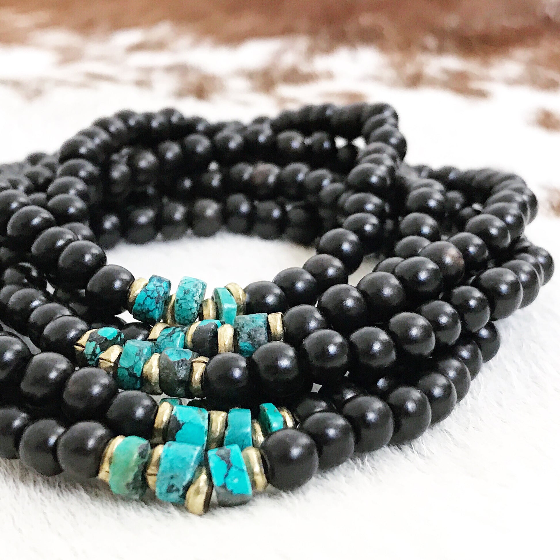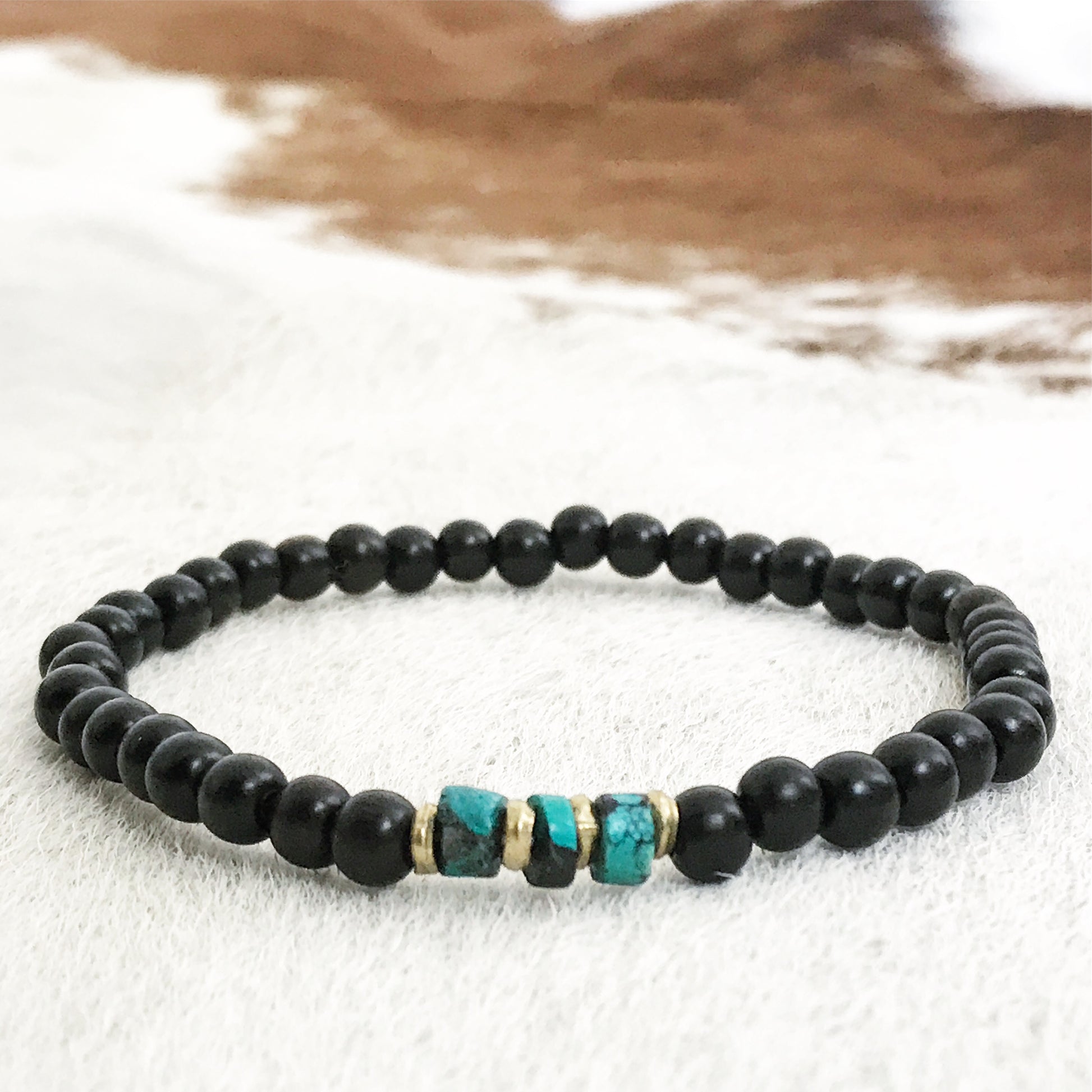 Ebony wood beads contrasted with brilliant turquoise and vintage brass. A beautiful statement piece on its own, or stacked with other bracelets.