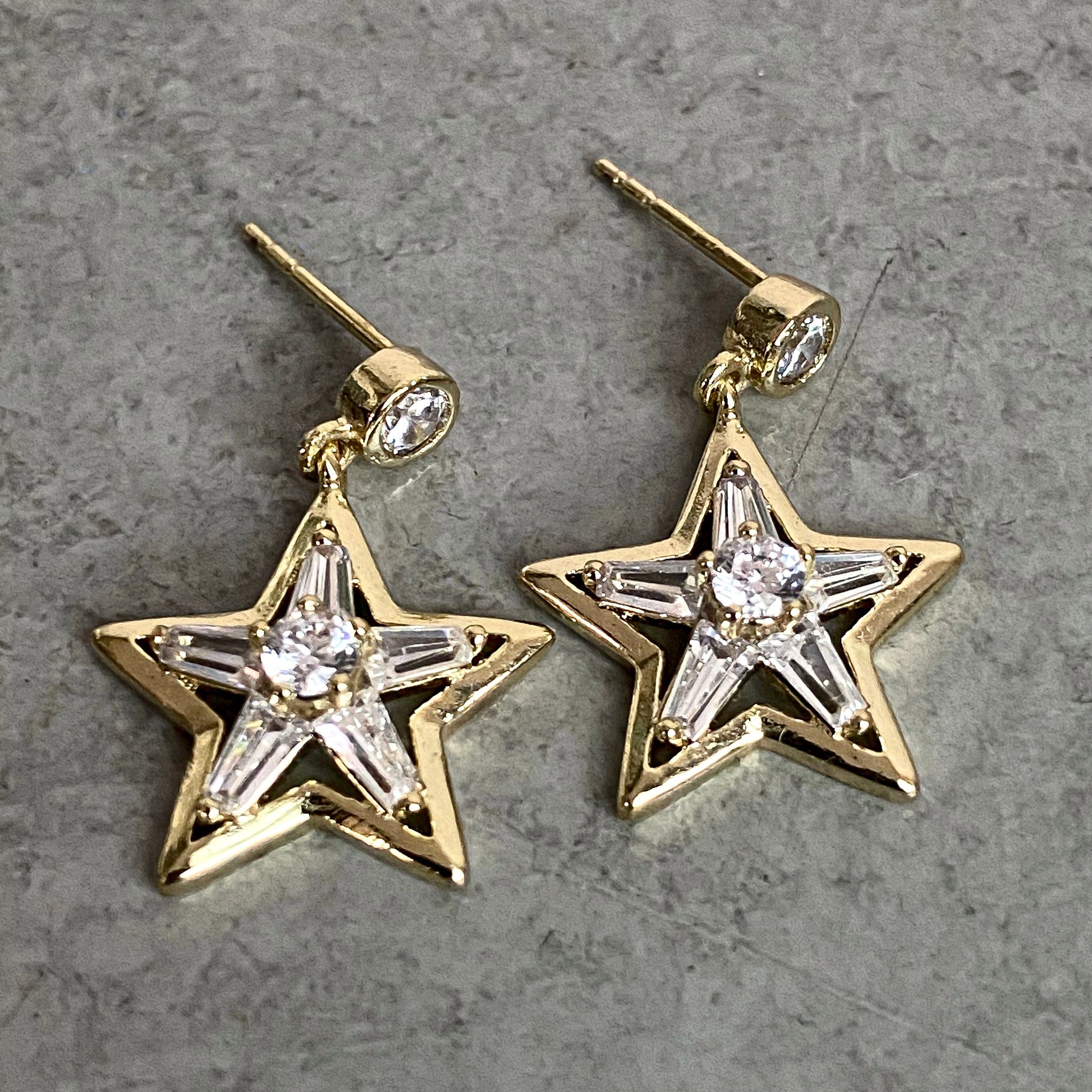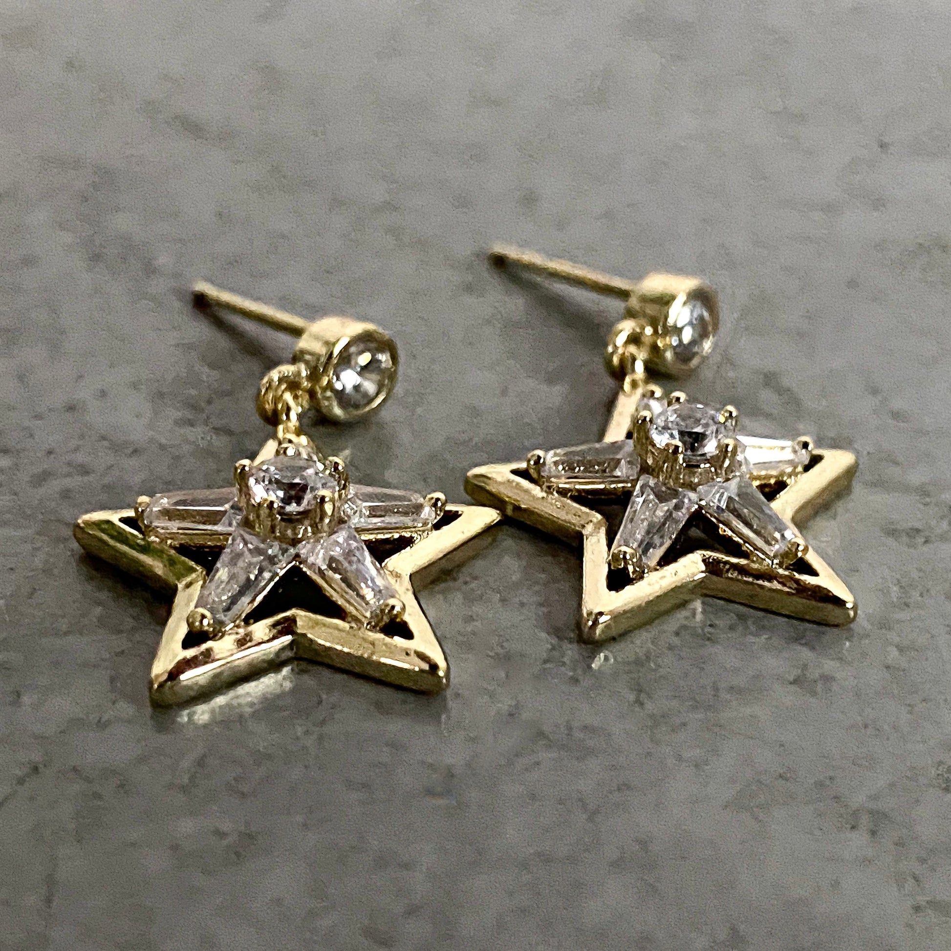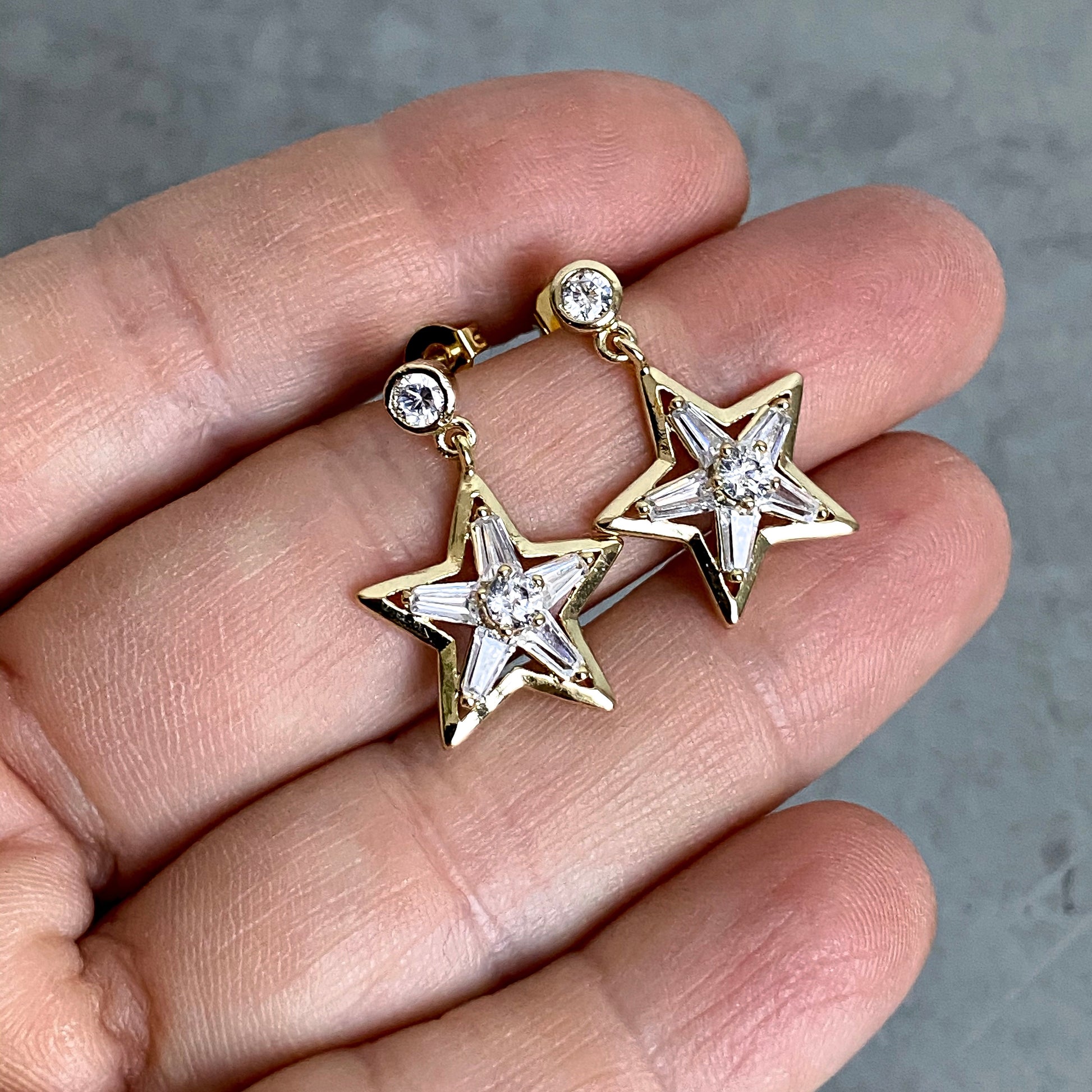 Handcrafted in 18k yellow gold thick plating over sterling, these super star earrings drop from gorgeous diamond stud posts. Baguette diamonds make up the star details. So brilliant — in color and shine.