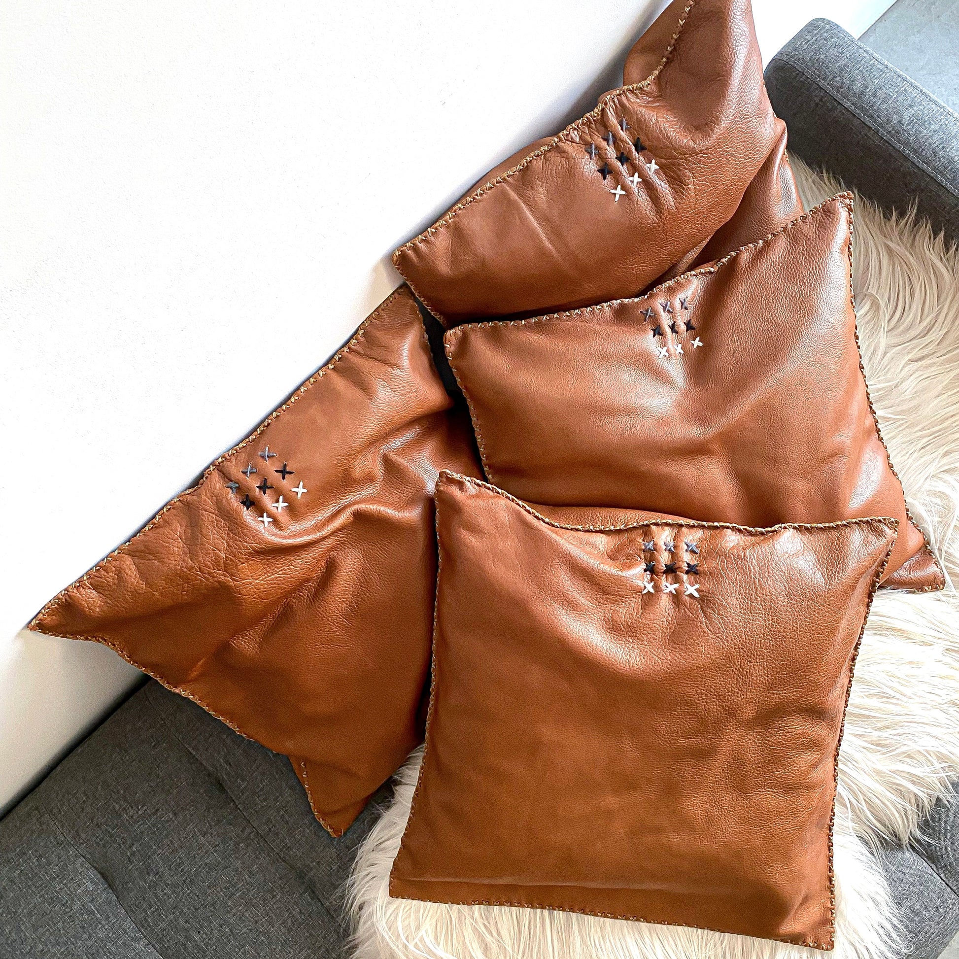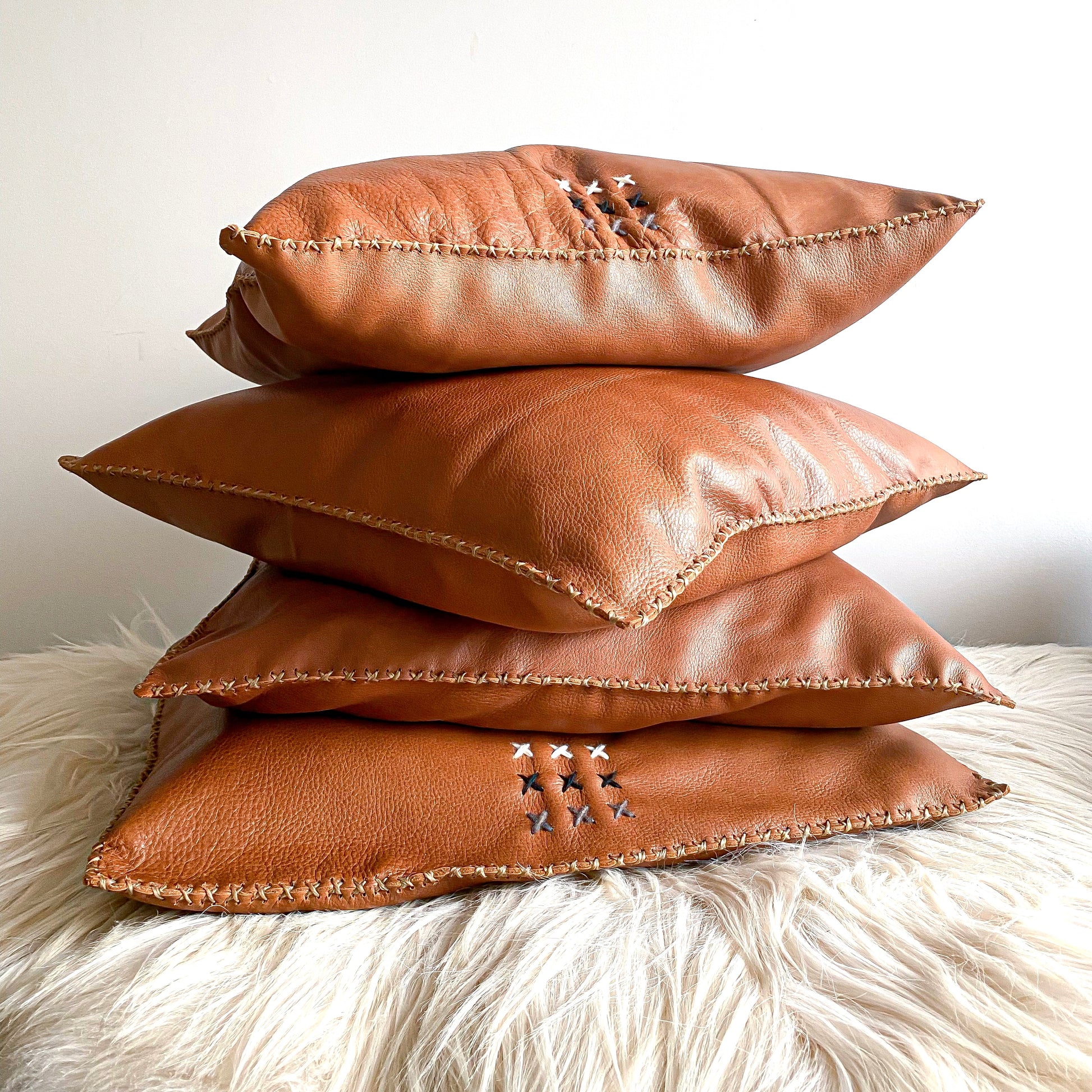 Level up your home decor with our amazing hand-cut and hand-stitched gorgeous top-grain leather pillows! We selected our favorite — soft yet tough whiskey leather that will slightly distress over time, looking even richer + more beautiful over the years.
