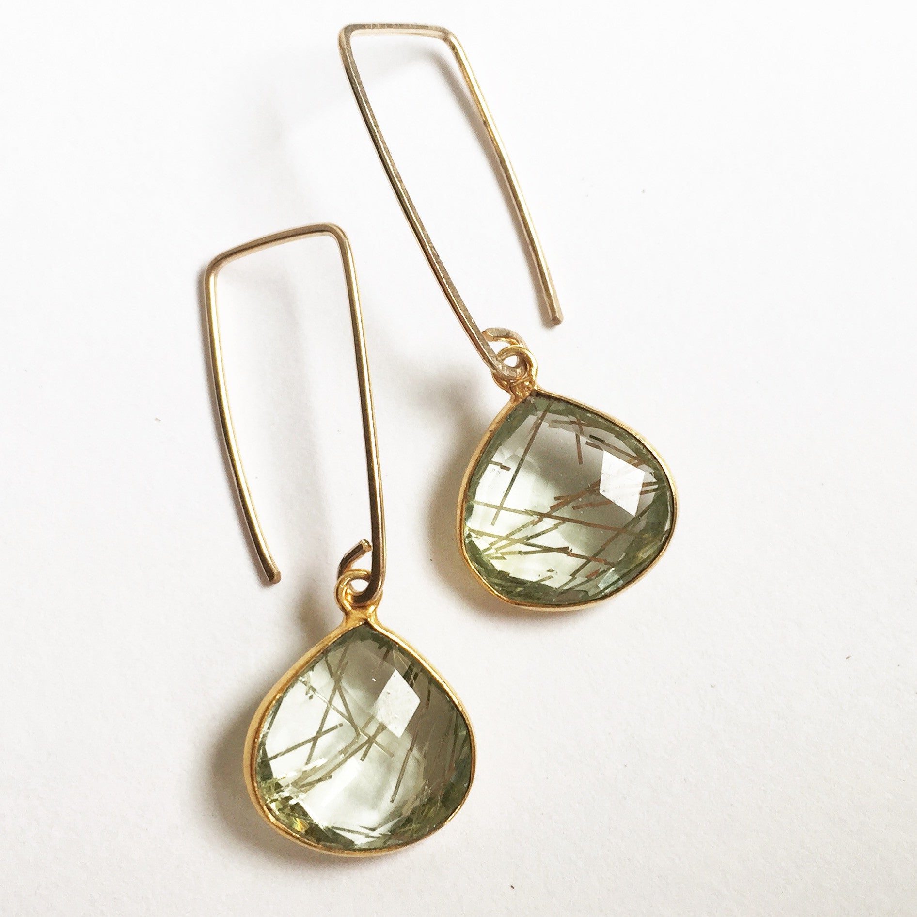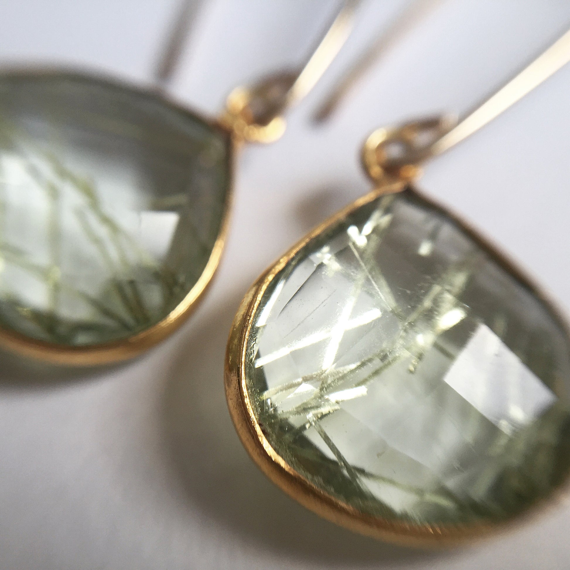 Rhutilated quartz briolettes in subtle green are set in 24 karat gold, and collect so much shimmering light as they dance around!