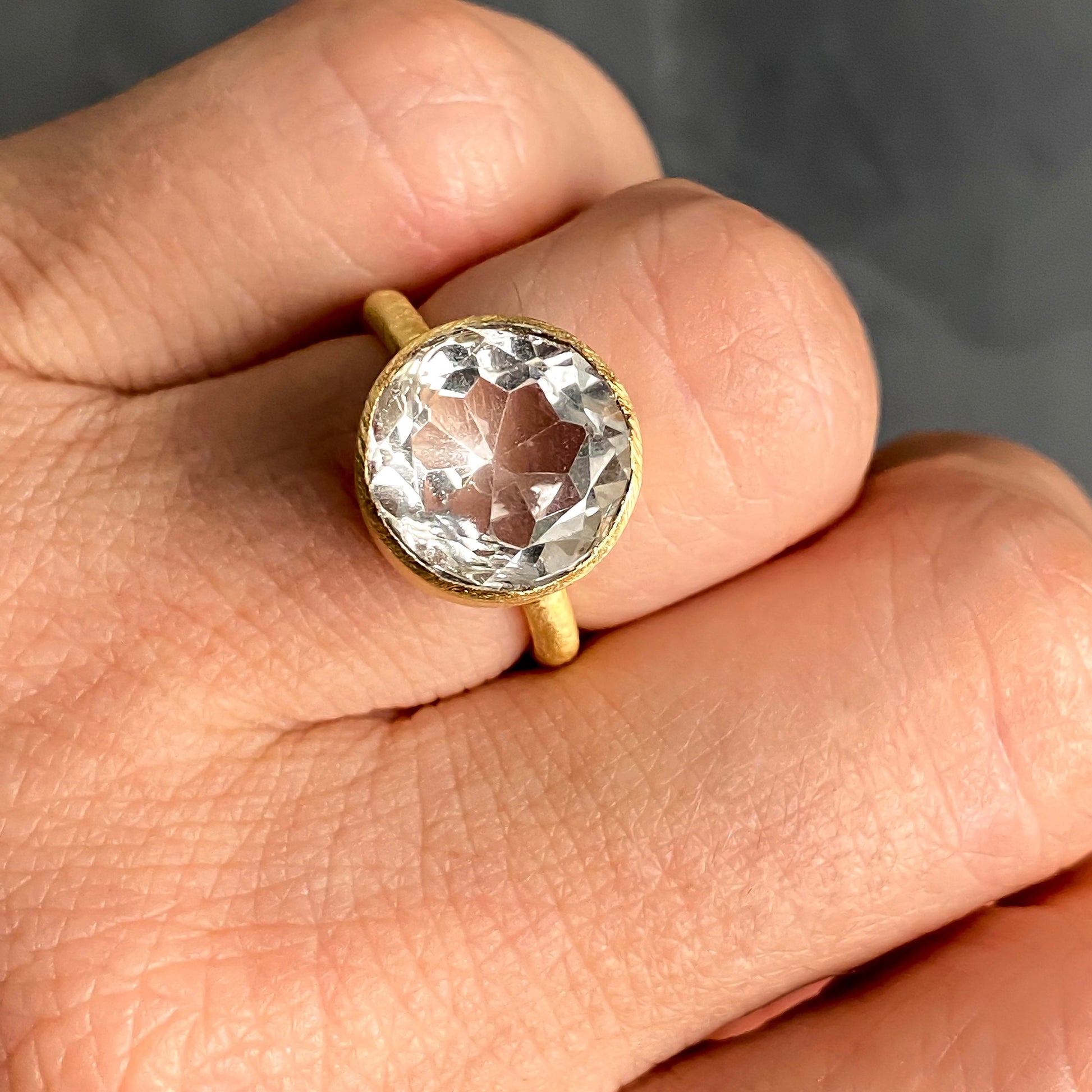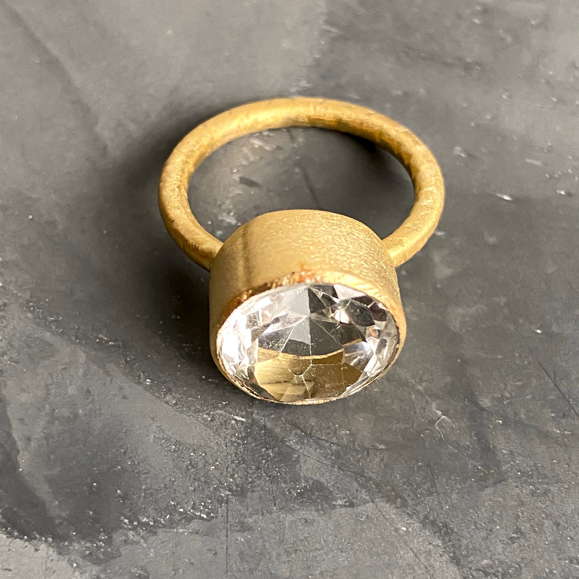 24 karat gold high polish flash on brass. To lengthen the life of your cocktail rings, we suggest wearing them for special occasions — protect from moisture, remove during workout, shower, and sleep.