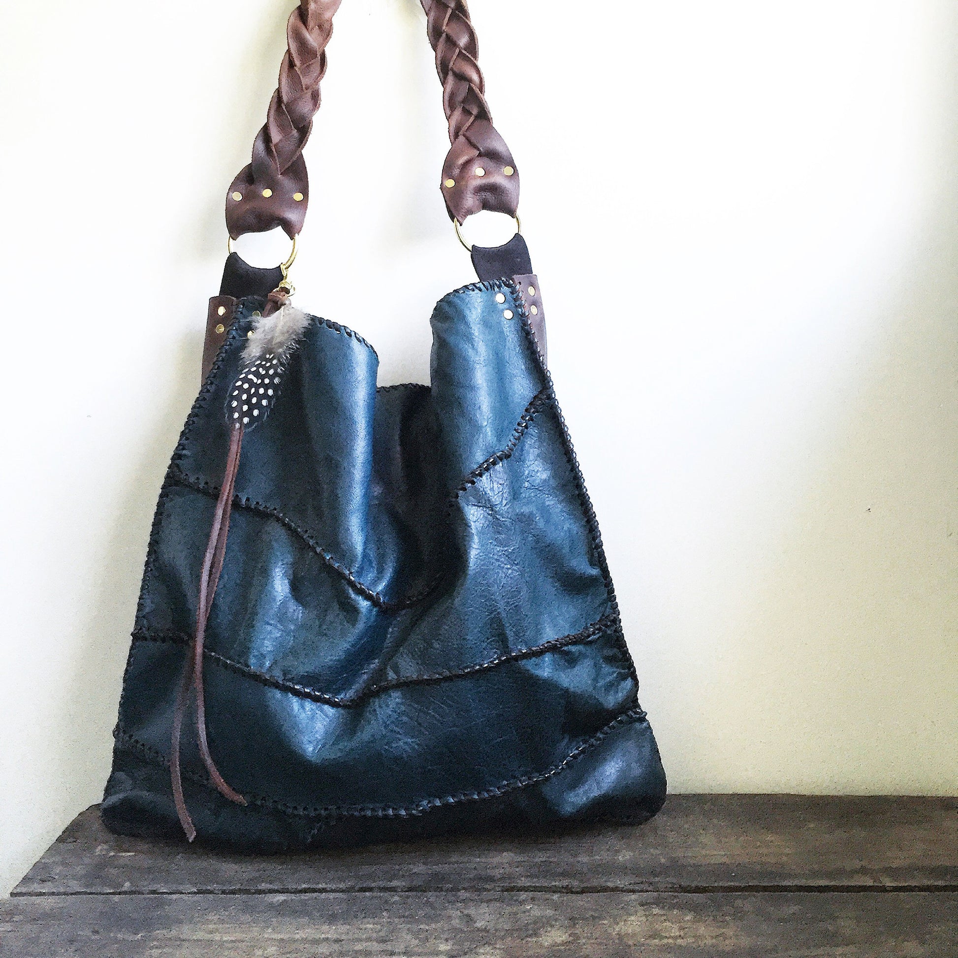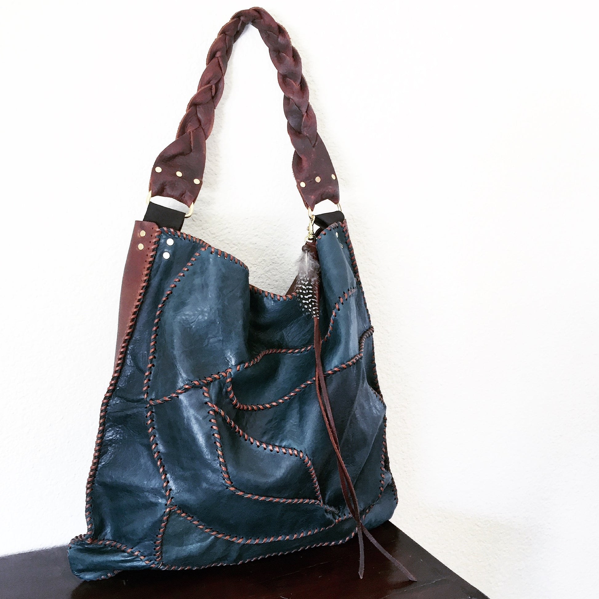 Super soft lambskin in the most gorgeous peacock blue. Sturdy, distressed saddle leather on the other side.