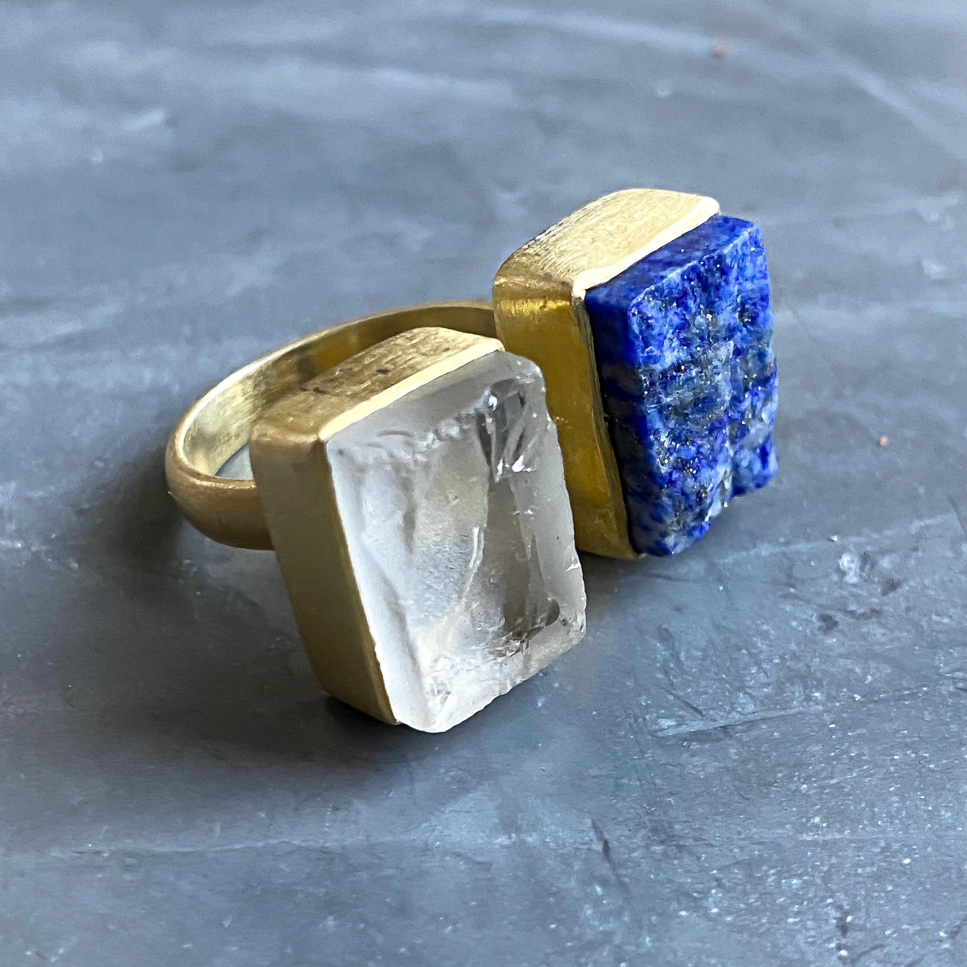 Rough cut raw clear quartz is a powerful healing stone, encouraging healthy mind, memory, and emotions. Lapis Lazuli is connected to the Third Eye and Throat Chakras, known as the wisdom stone. This crystal raises the vibration of your soul, encouraging you to speak your truth.