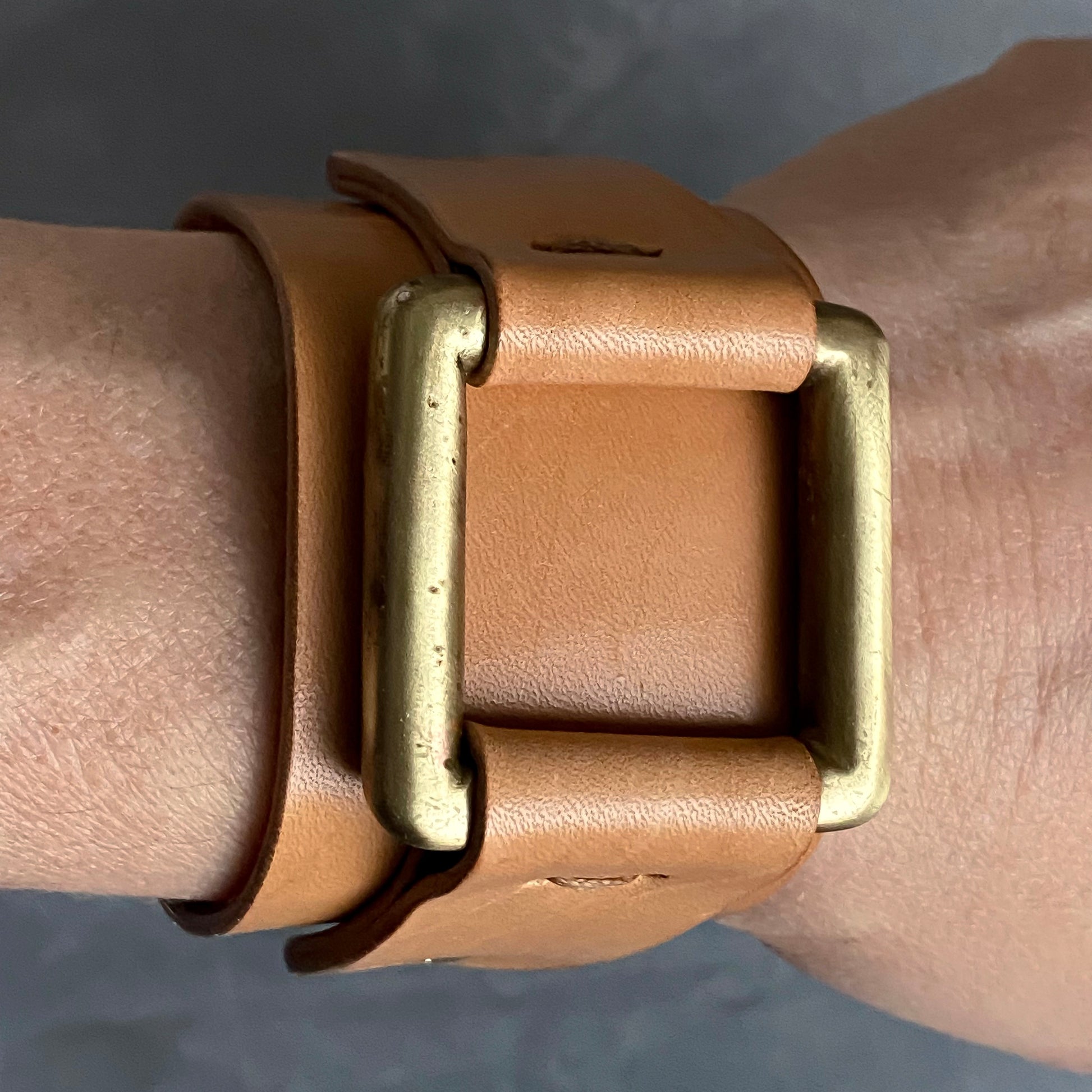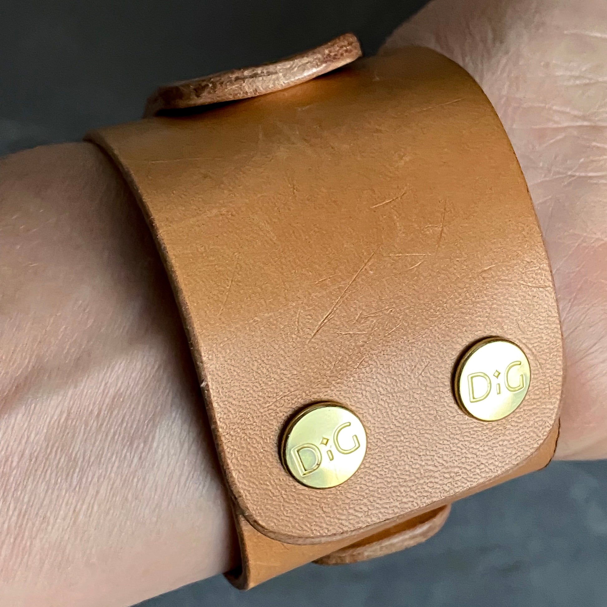 Gorgeous veg-tan leather with bronze centerpiece… Wear solo as a simple statement, or stack with our beaded stretch bracelets for a glam loil.
