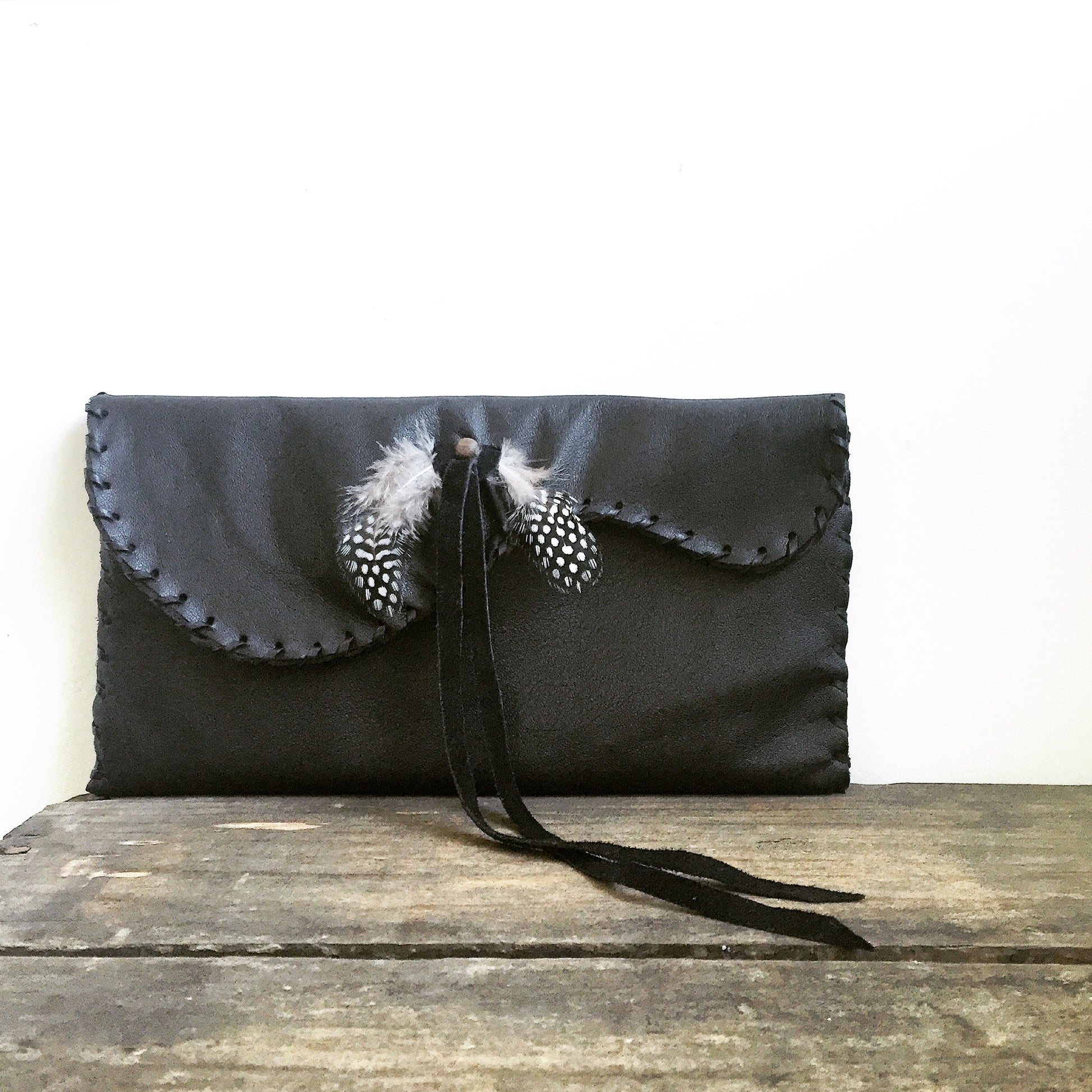 Our black leather clutch is so rich and so soft! Designed by hand with monochrome stitching.