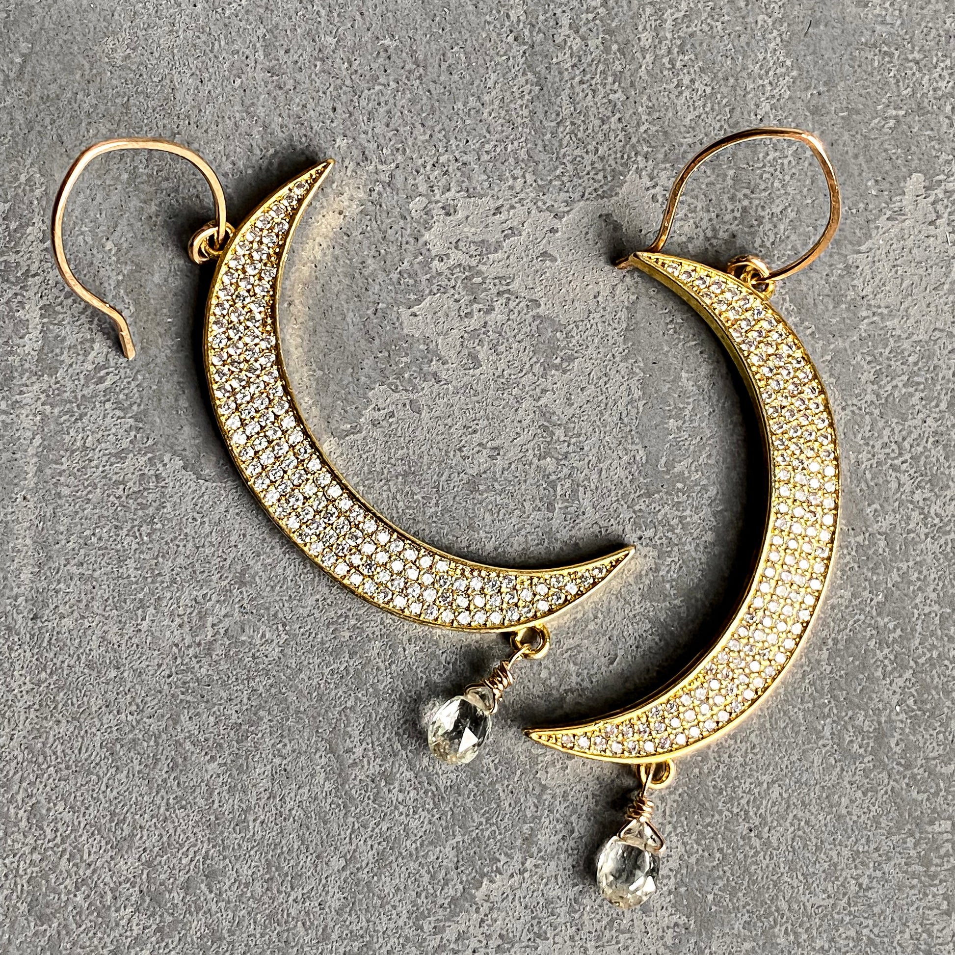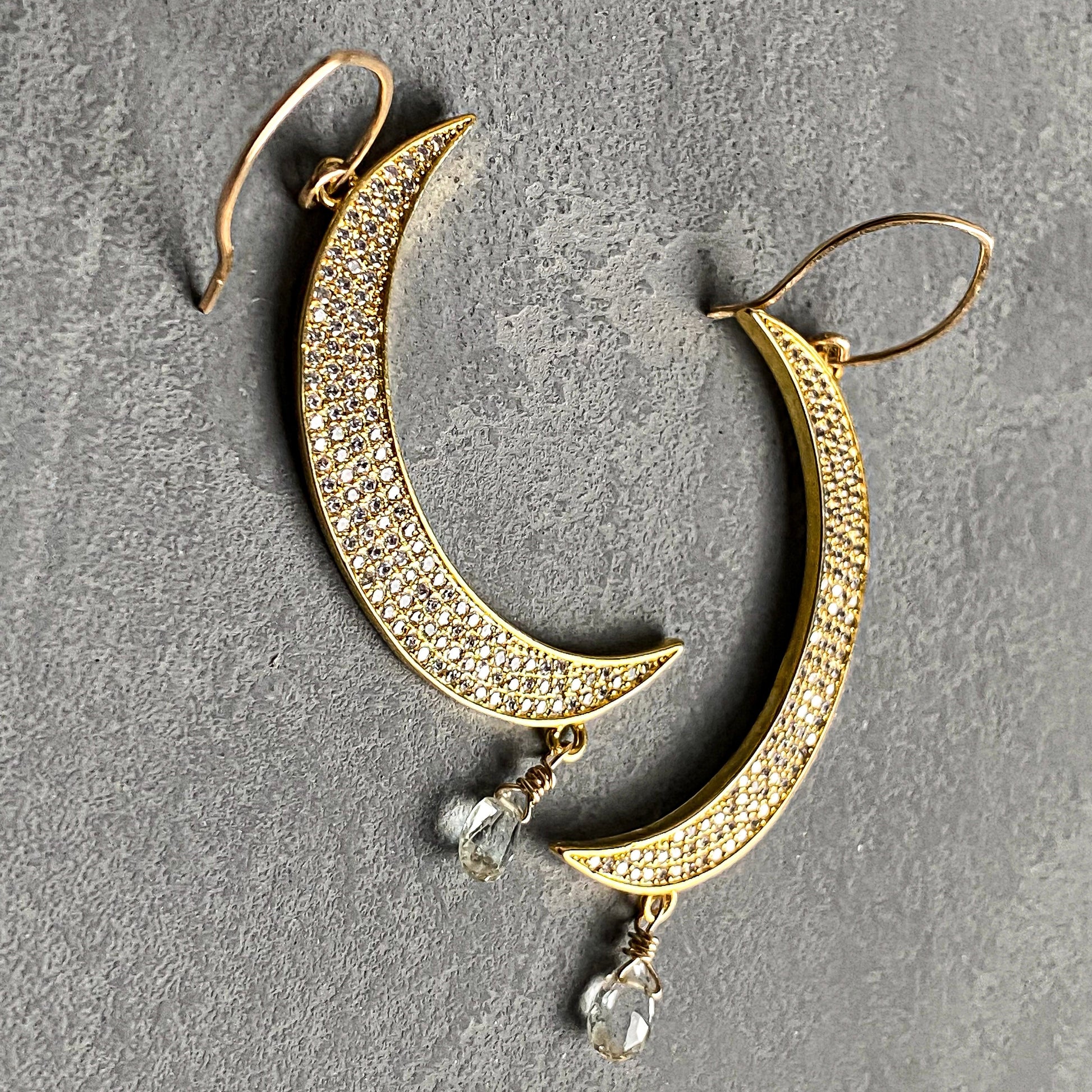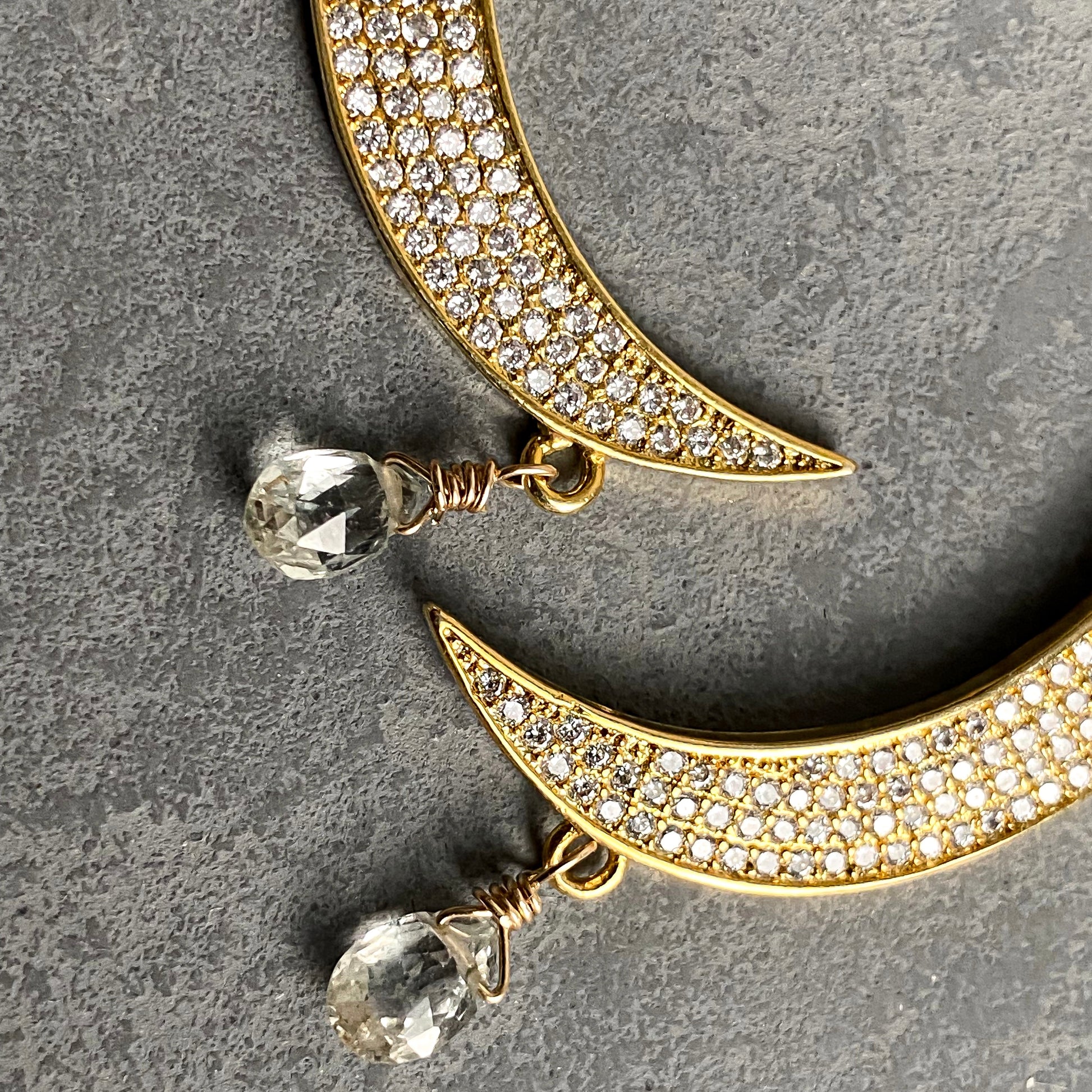 Instant glam! Aquamarine briollete gems wrapped in gold, and swing below the most stunning micro-pave crescent moons!