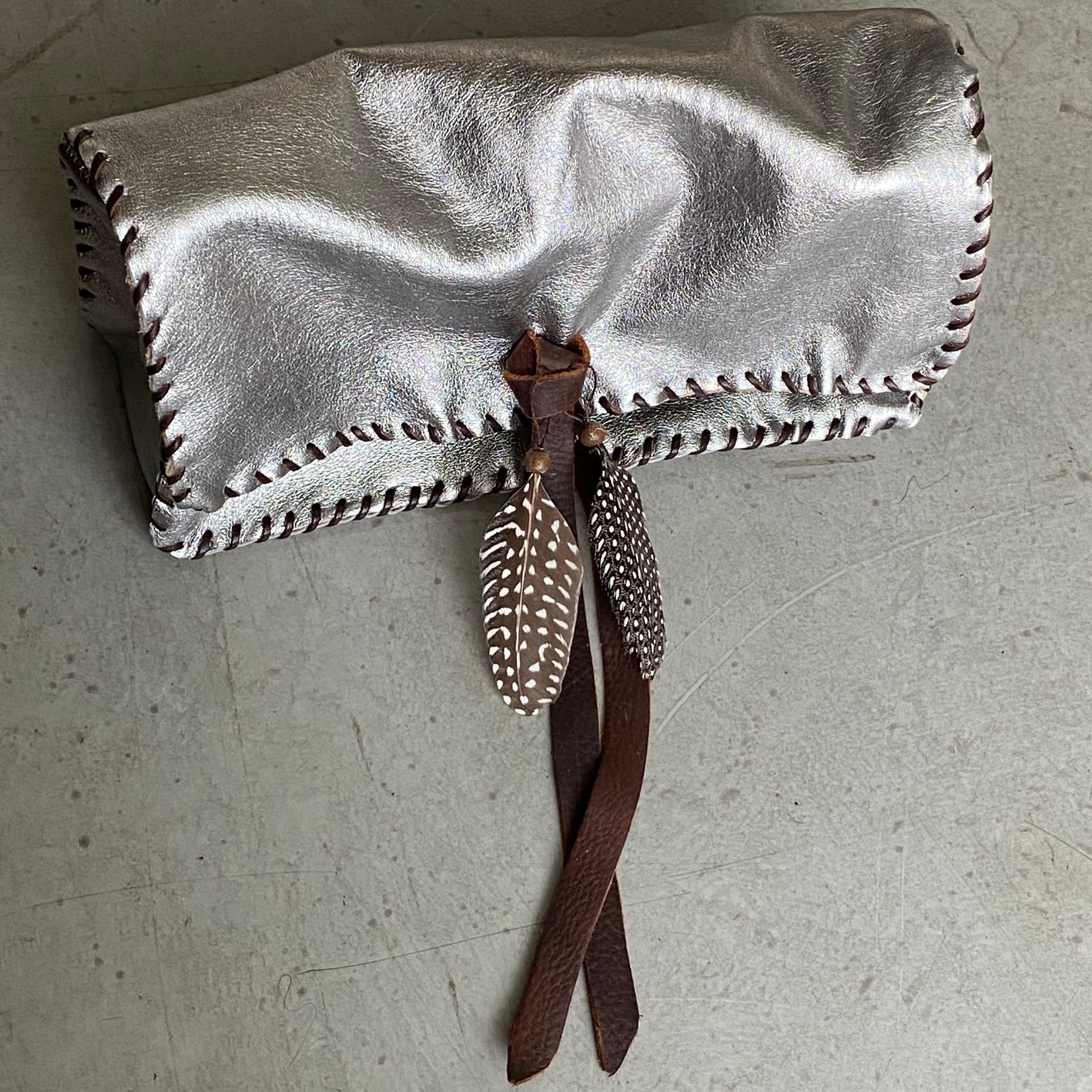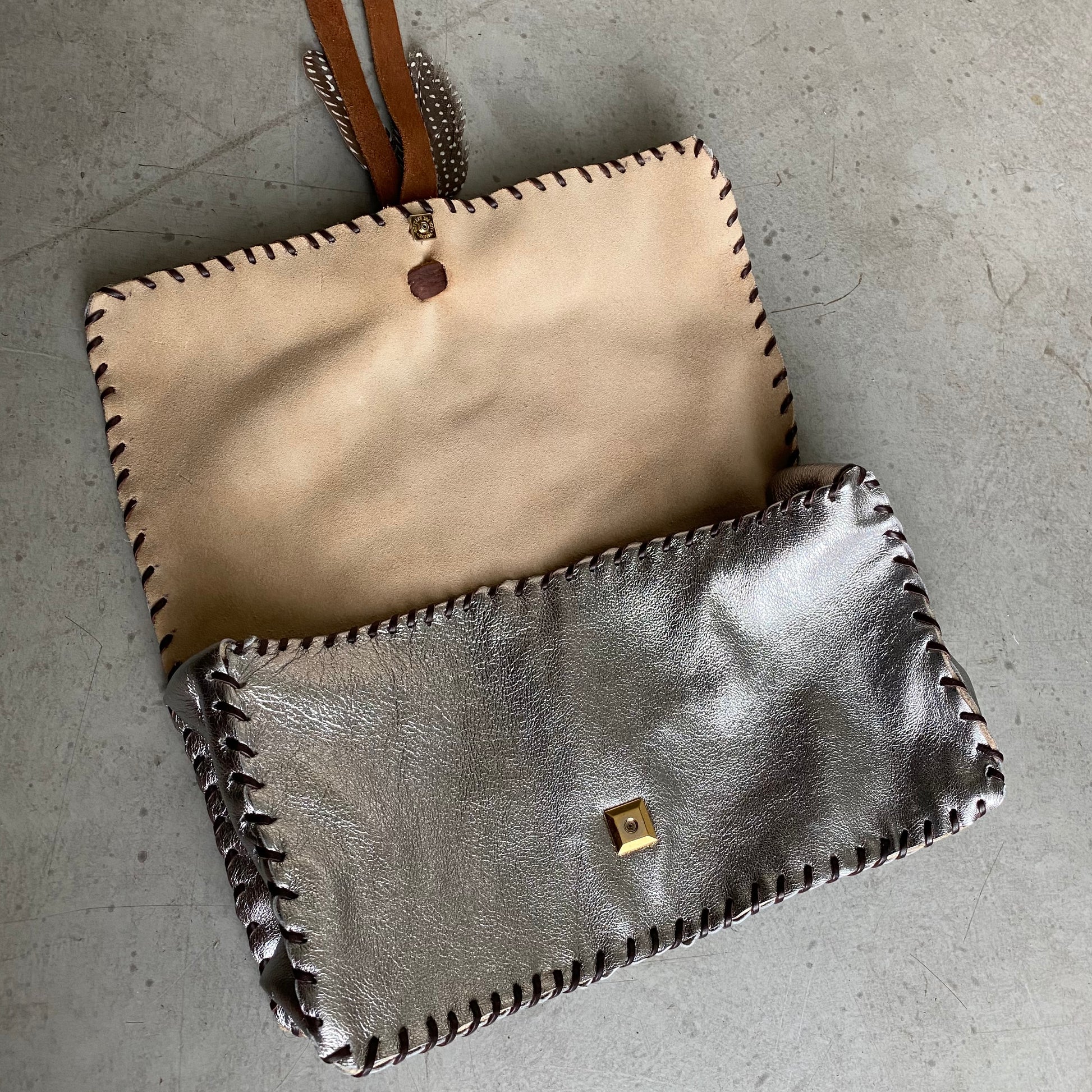 Magnetic closure, iron-branded label, gorgeous hen feather + leather tassel, calf lacing stitch. Beautifully unique with no detail left undone.