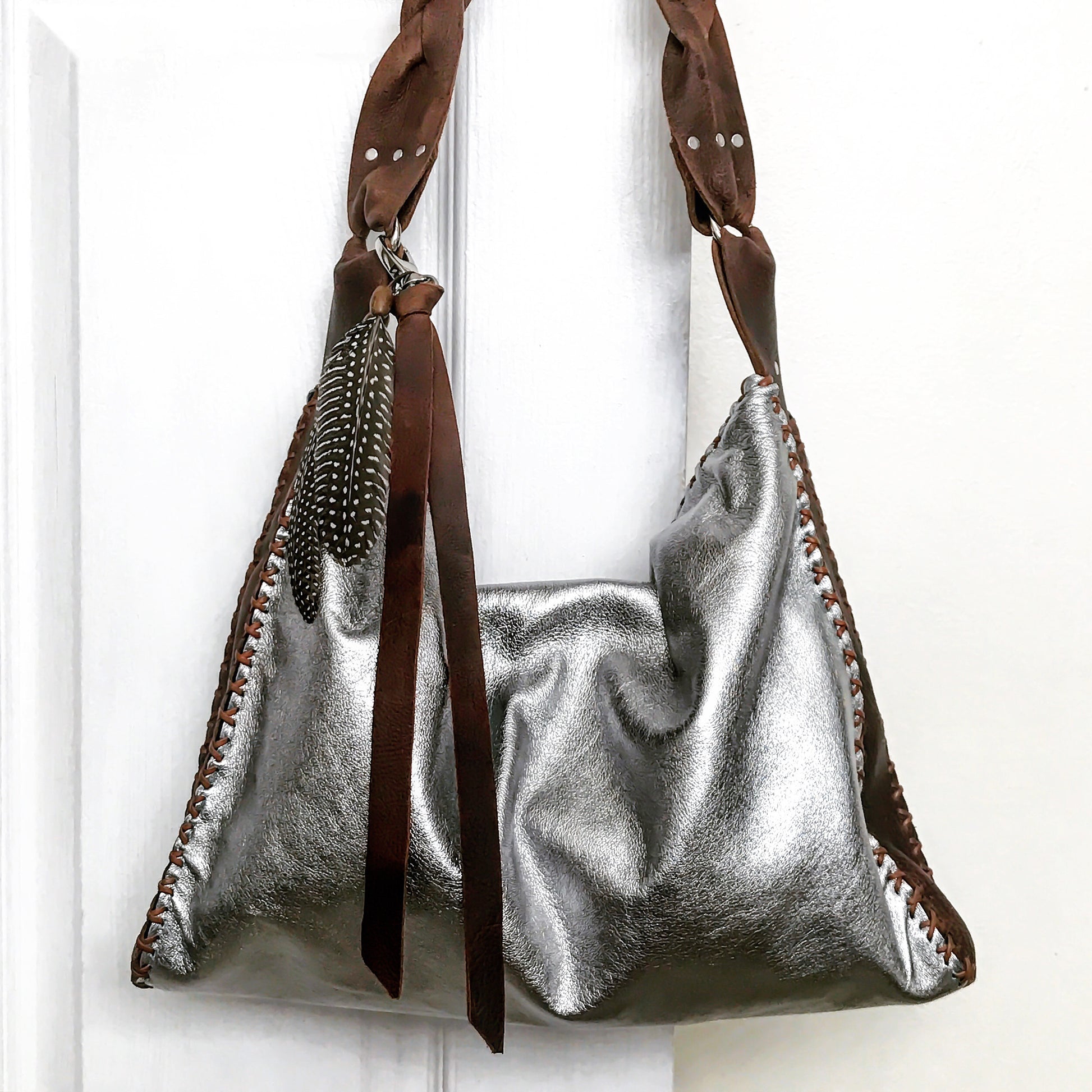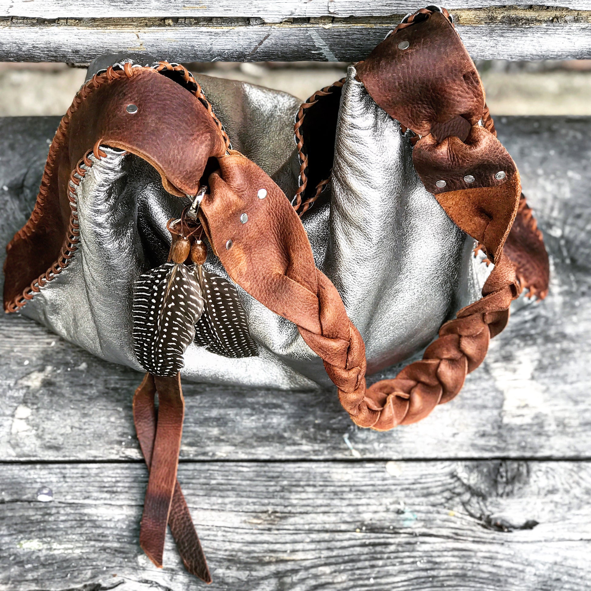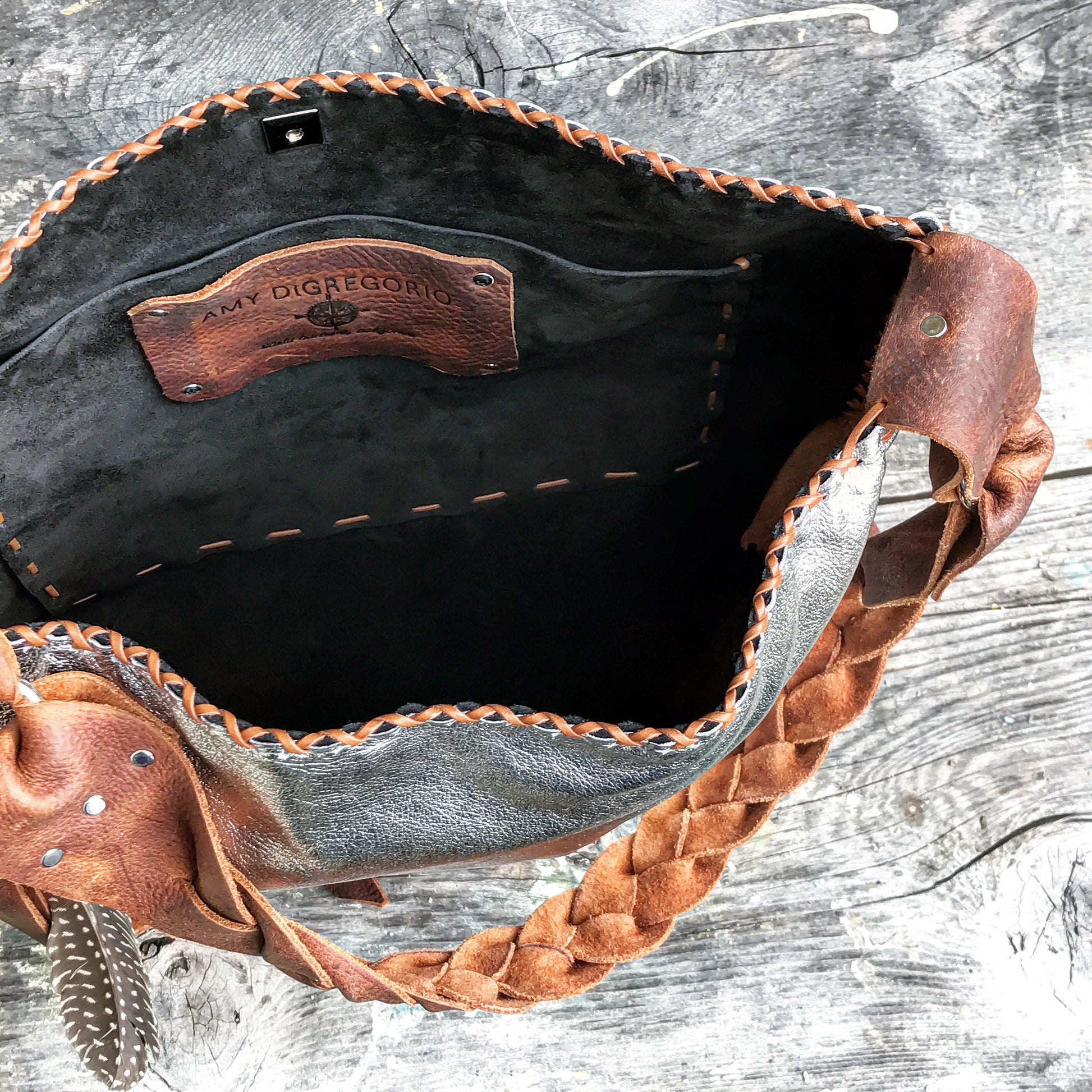 Fine metal hardware, magnetic closure, iron-branded label, a gorgeous {removable} hen feather + leather tassel. Signature x-stitching with calf lacing. Beautifully unique with no detail left undone.