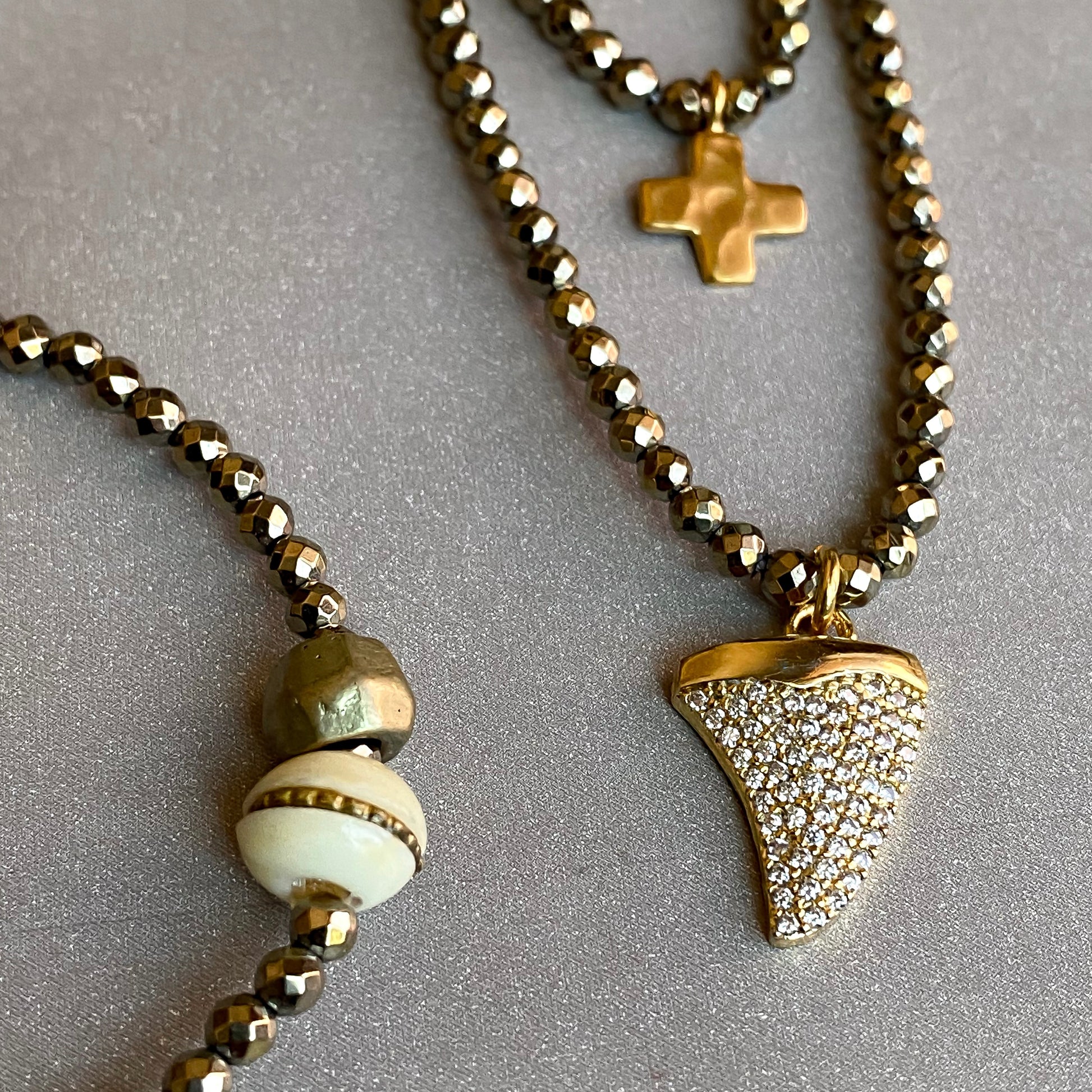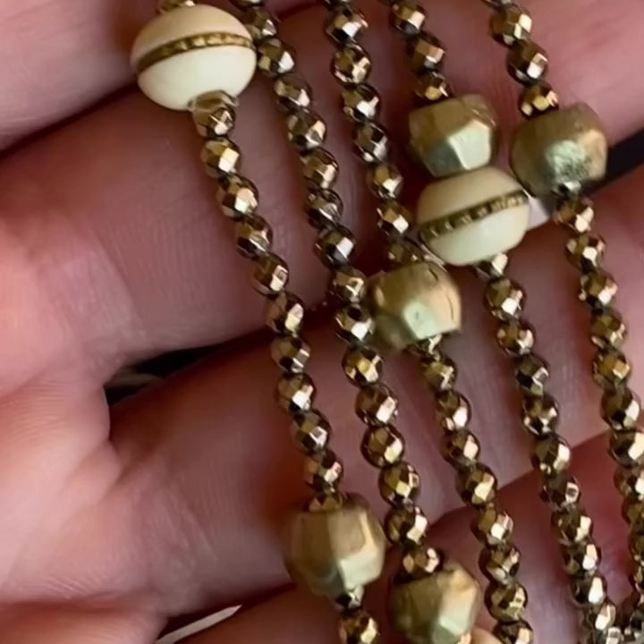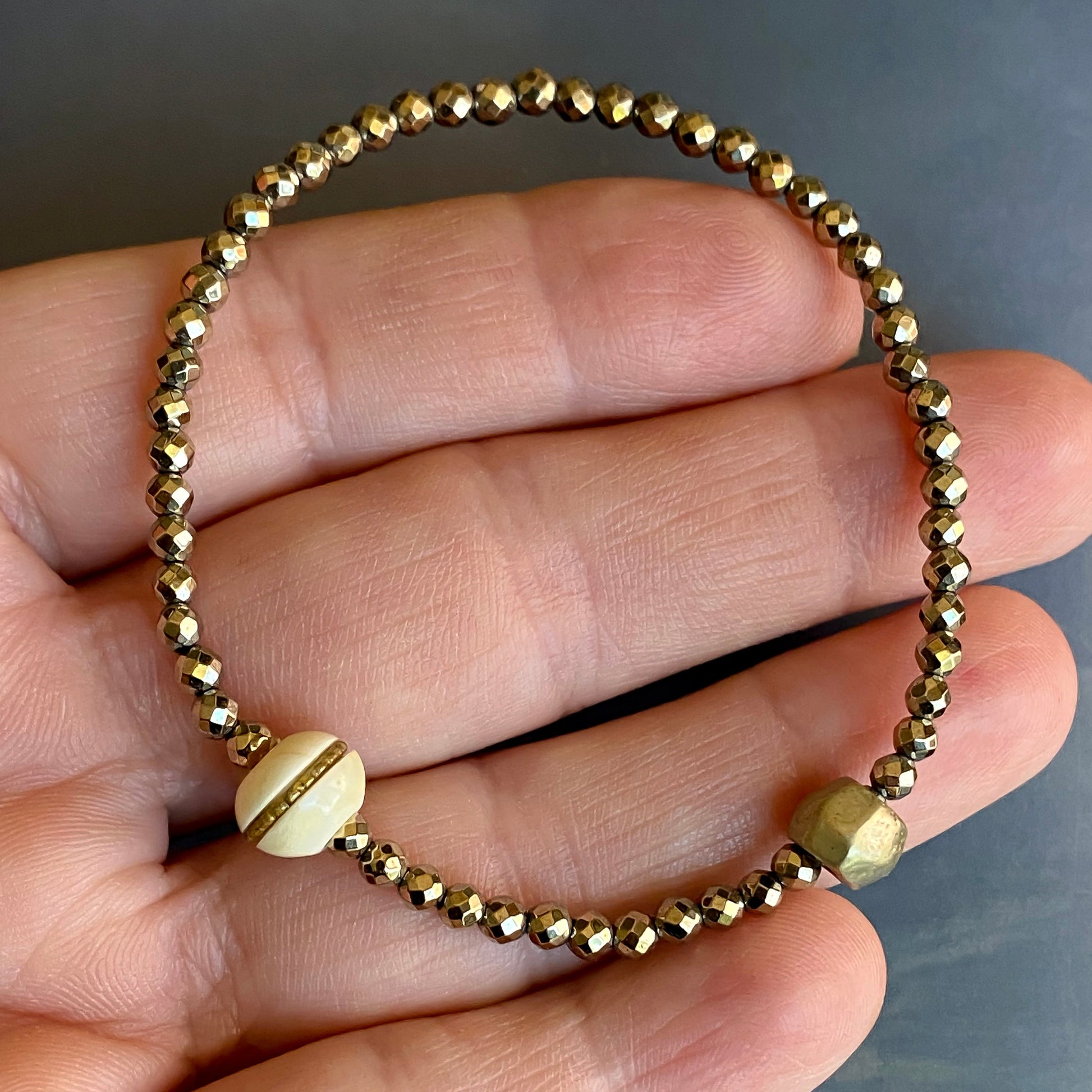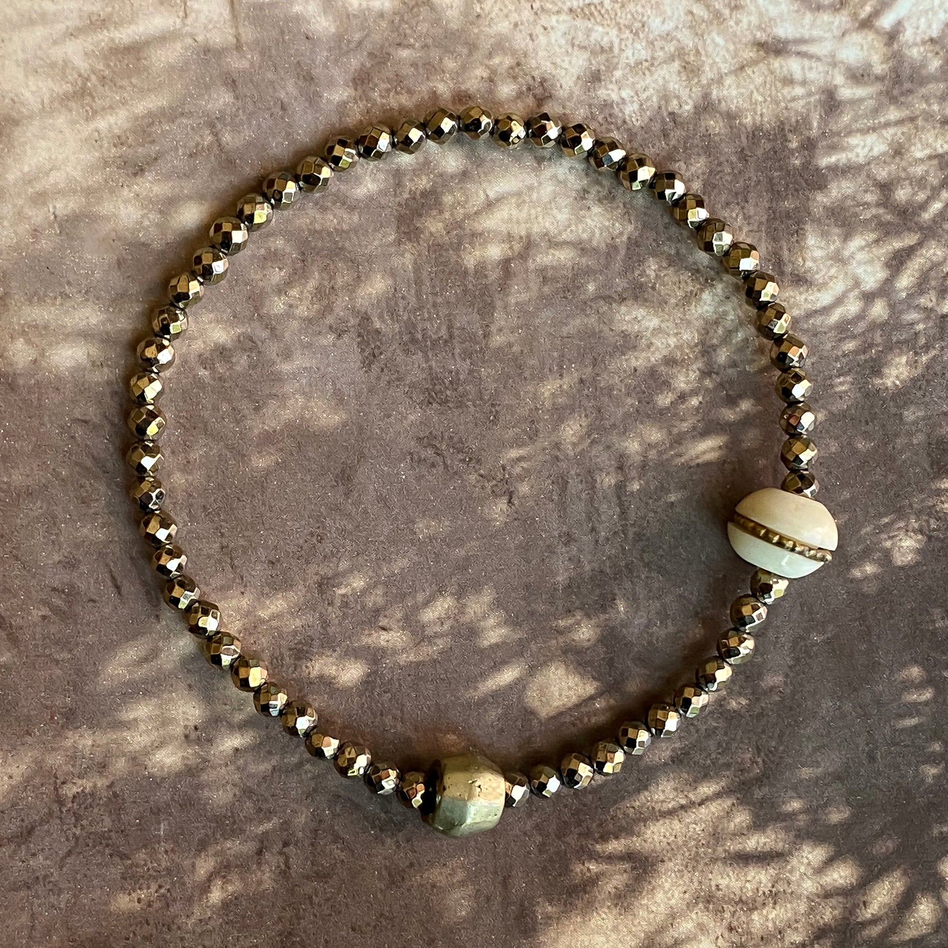 This shimmering stacking bracelet showcases glimmering gunmetal pyrite gems, accented with brass and bone beads for an effortlessly organic touch.