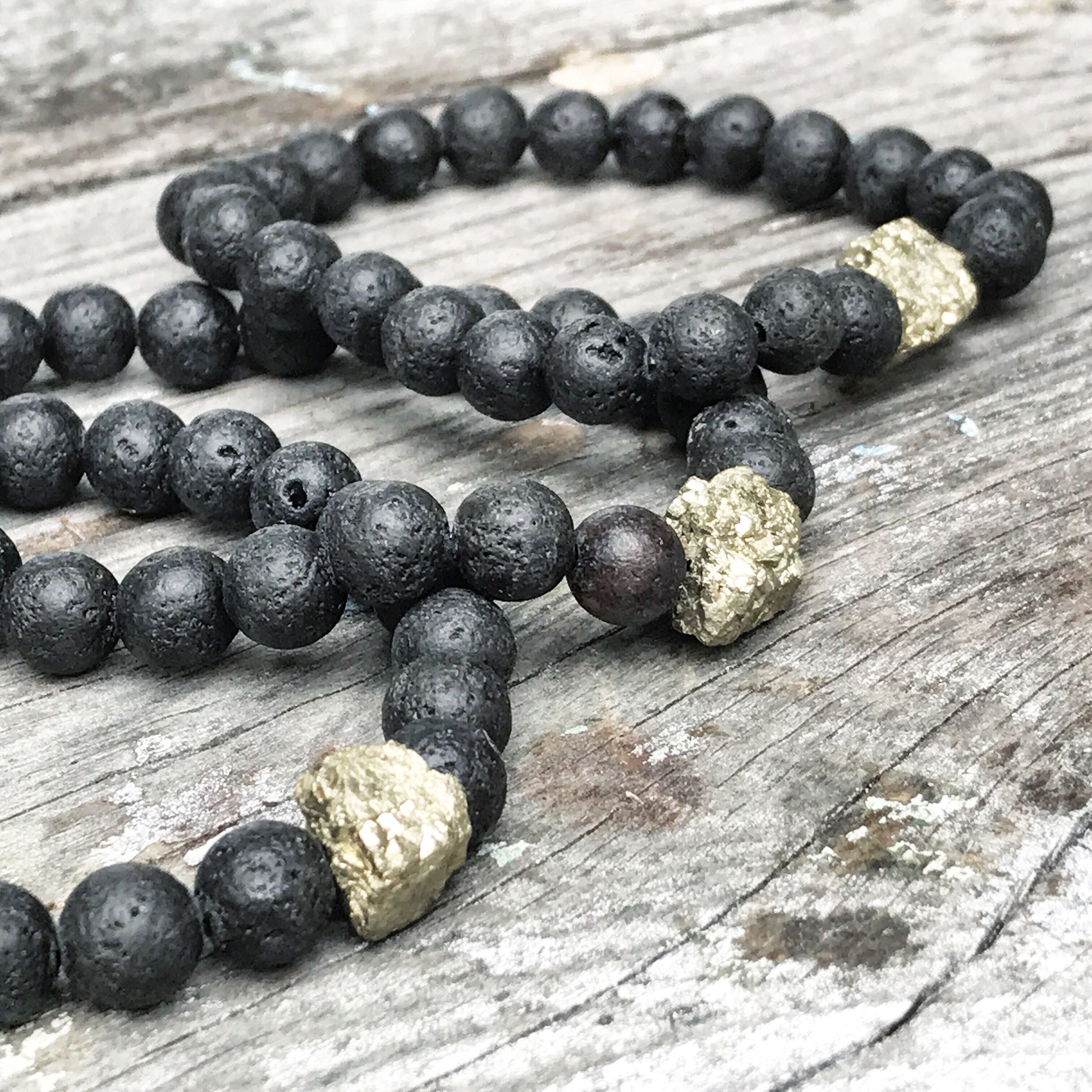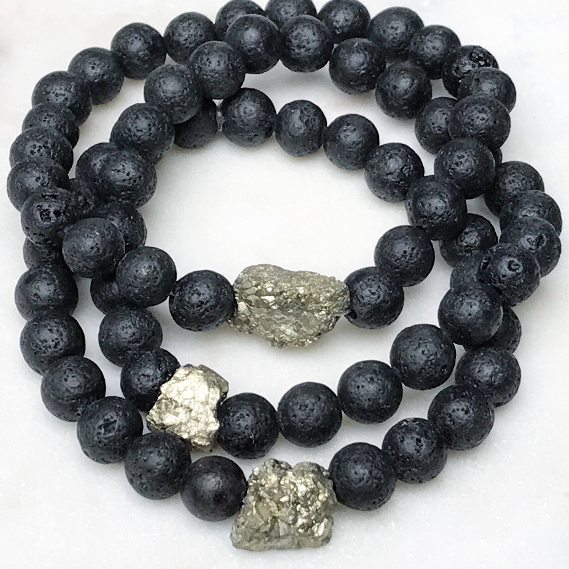 Wear lava rock for its grounding and calming qualities. Wear pyrite for prosperity and to promote physical well-being — enhancing strength of mind and willpower.