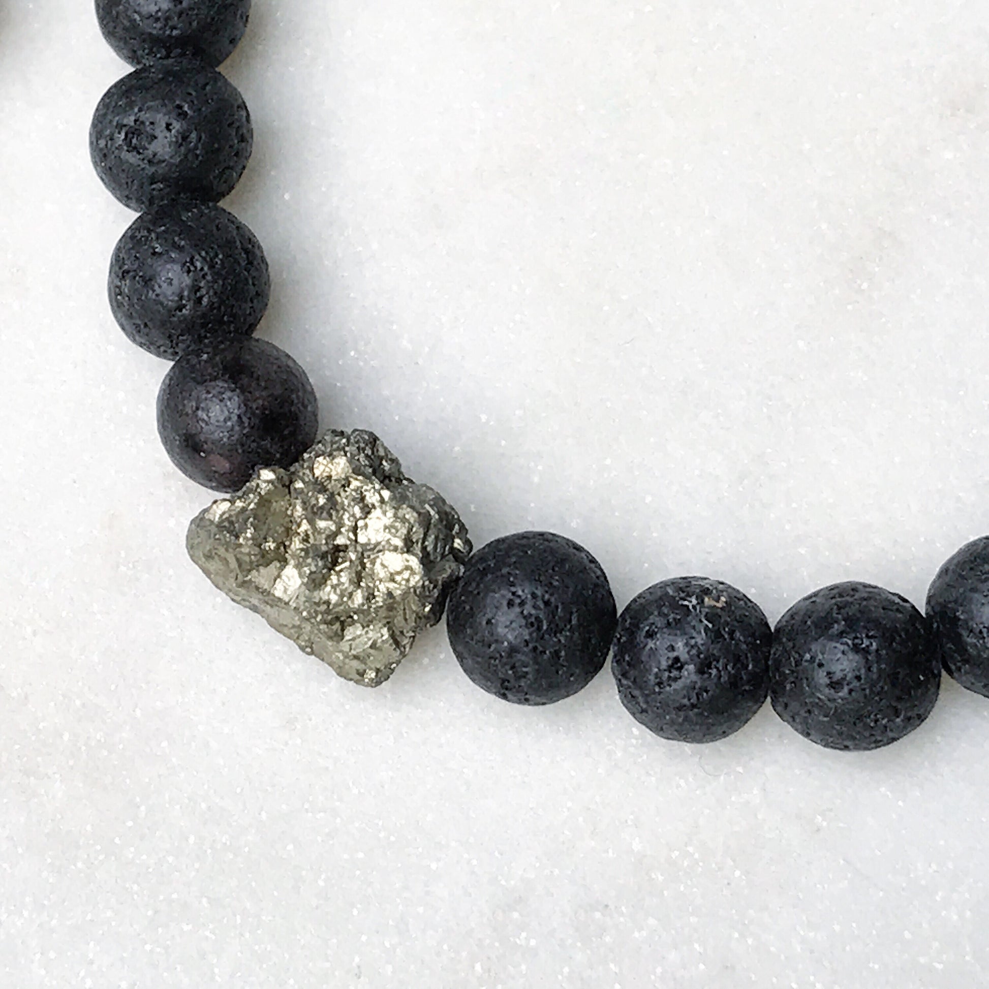 Lava rock beads accented with a gorgeous raw pyrite stone. A beautiful statement piece on its own, or stacked with other bracelets.