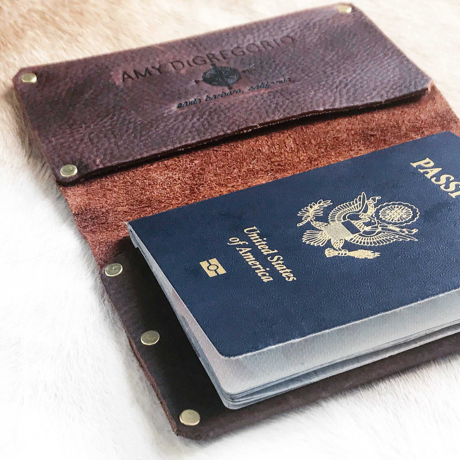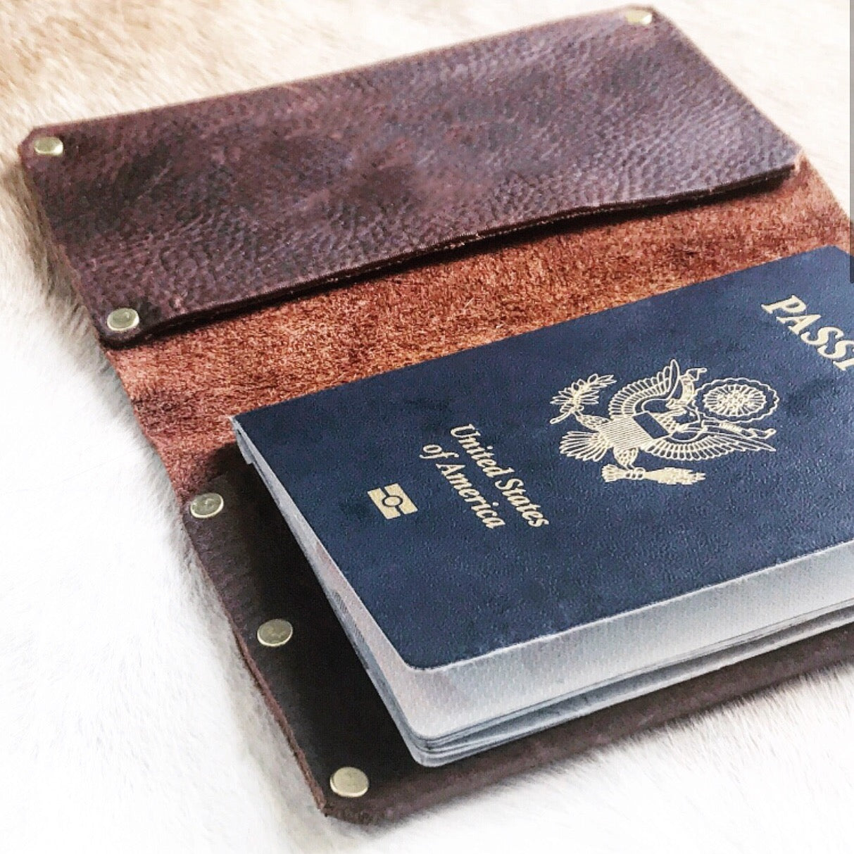 We believe your traveling journeys should be as convenient as possible! The left side holds your boarding passes — the stub that is torn off just folds down to fit, or folds back up for authorities to easily access. The passport is slipped in so that when opened, your photo is readily accessible. There’s also a slot in the leather on the right side that holds a few cards — perfect for your credit card to easily grab for check-in + airport purchases + not having to fuss with anything else in your entire bag during rushed transactions.