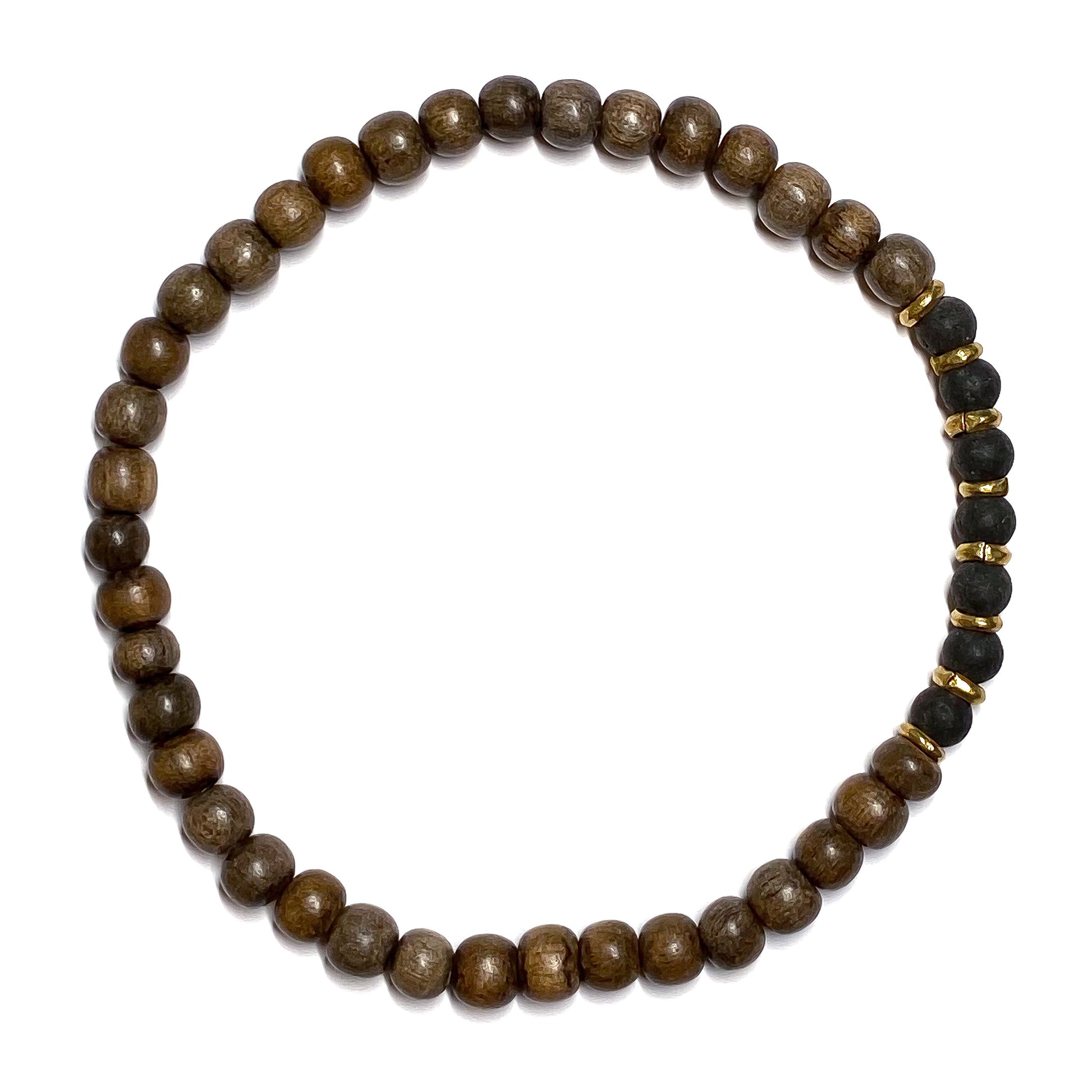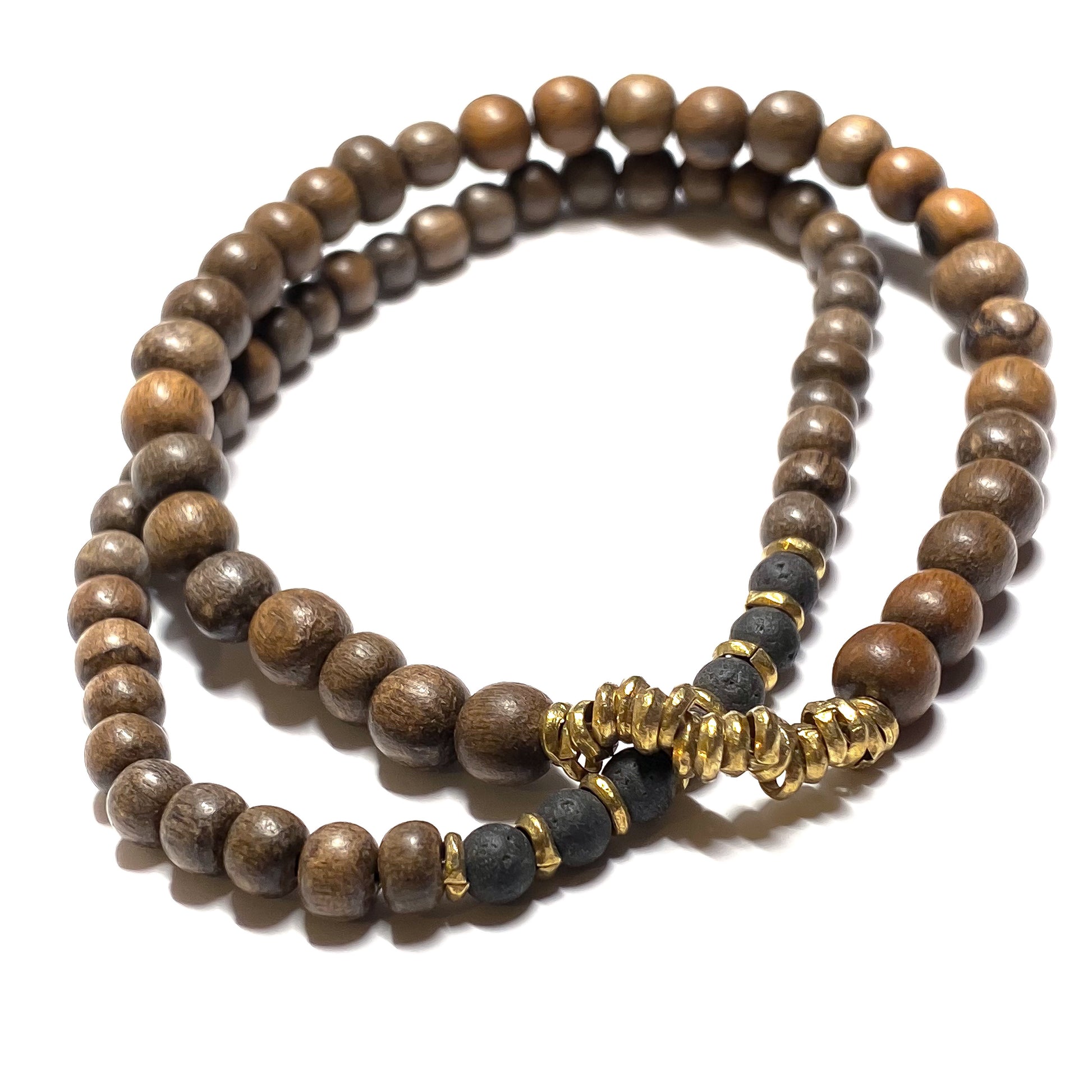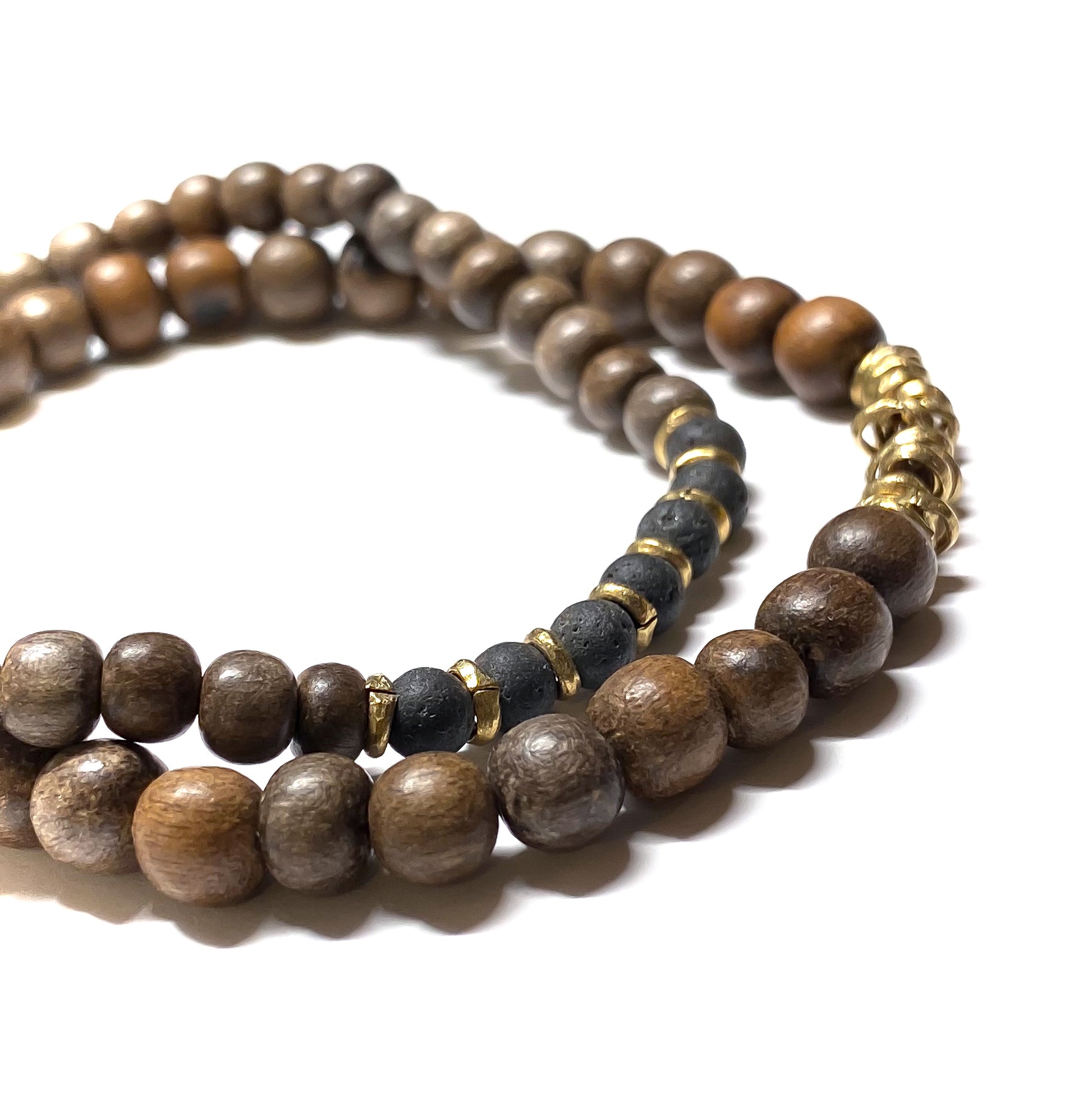 Small black lava stones and wood contrasted with Indian vintage brass beads.