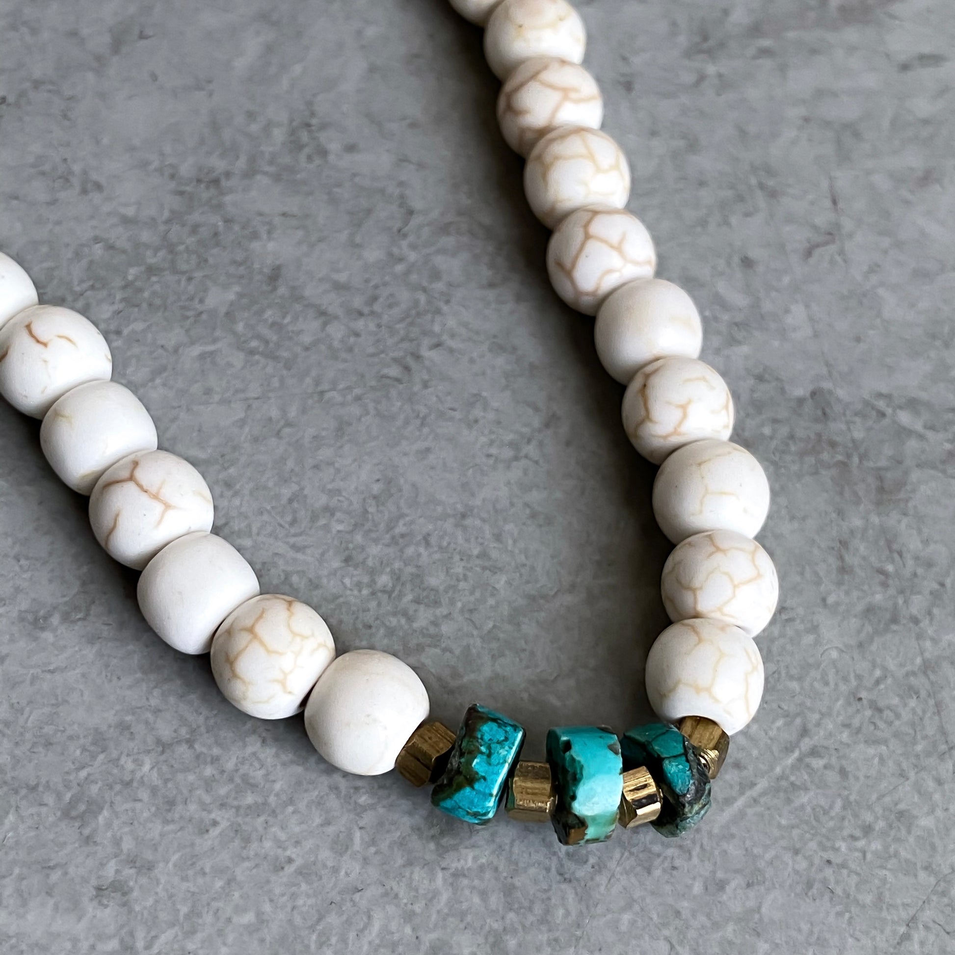 Magnesite beads are contrasted with brilliant turquoise and vintage brass. An eye catching piece on its own, or stacked with other bracelets!